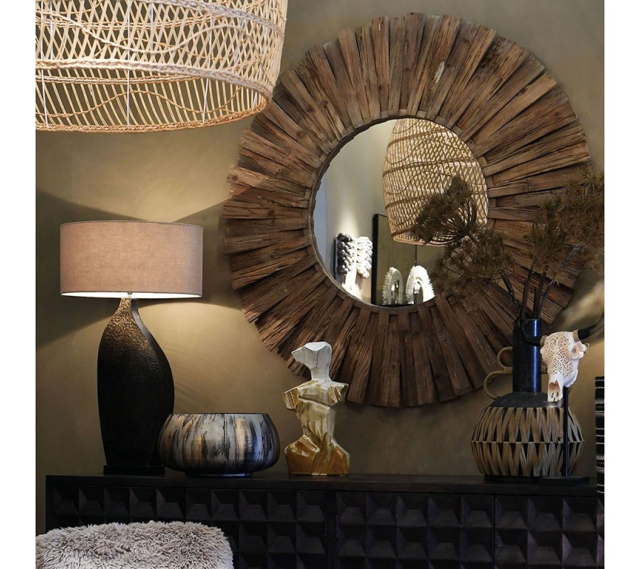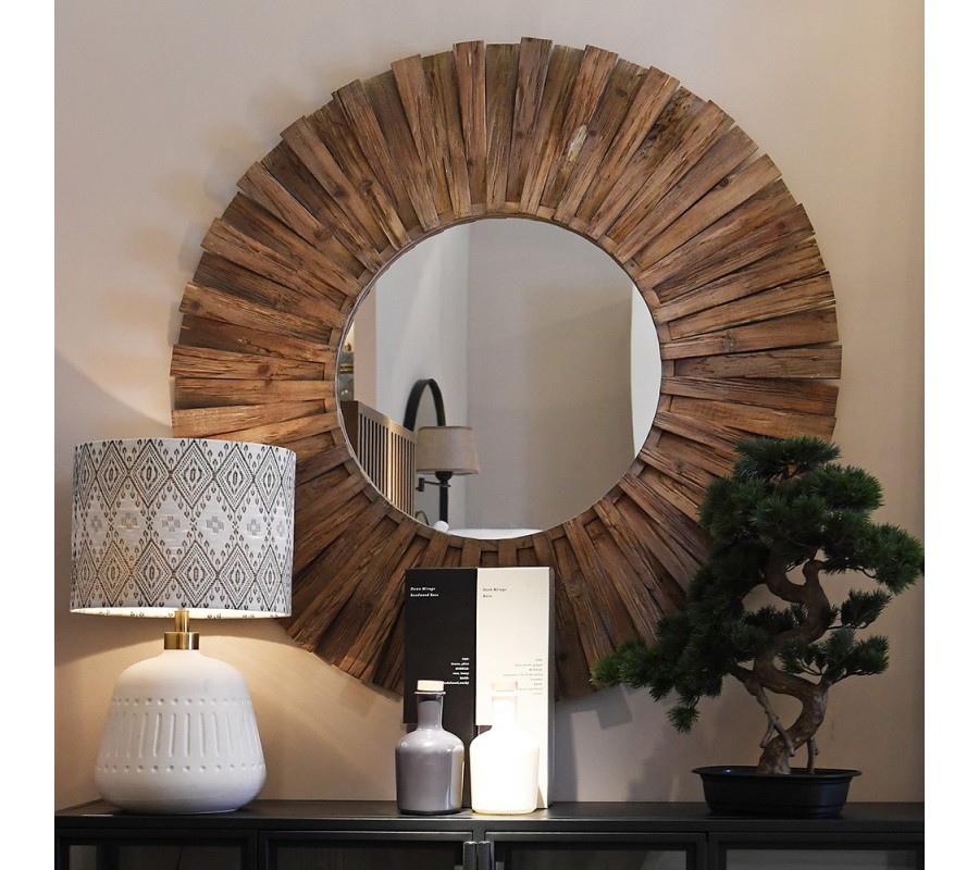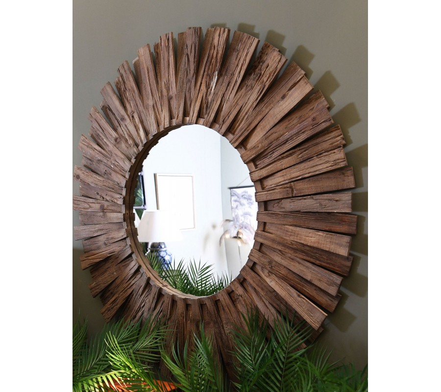 Dizajnové etno okrúhle nástenné zrkadlo Radiant má rám z dreva s jemne patinovaným povrchom, ktorý evokuje vintage štýl. Povrch rámu obsahuje úpravu s efektom prirodzeného opotrebovania, pričom jeho prírodný hnedý odtieň s jemnými farebnými prechodmi zvýrazňuje štruktúru materiálu. Tvar rámu je okrúhly, zložený z vrstvených drevených líšt, ktoré zrkadlu dodávajú elegantný vzhľad.