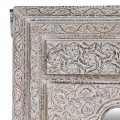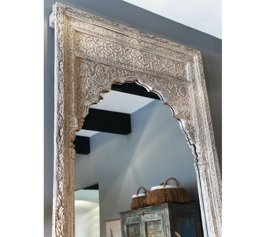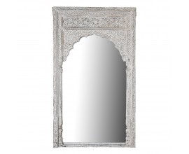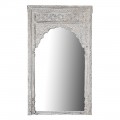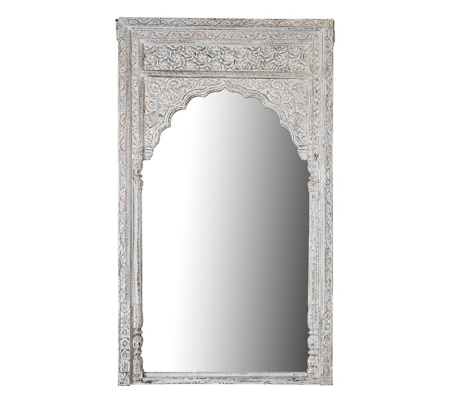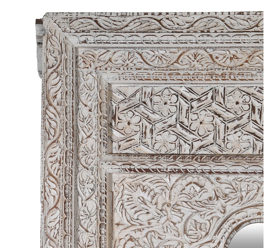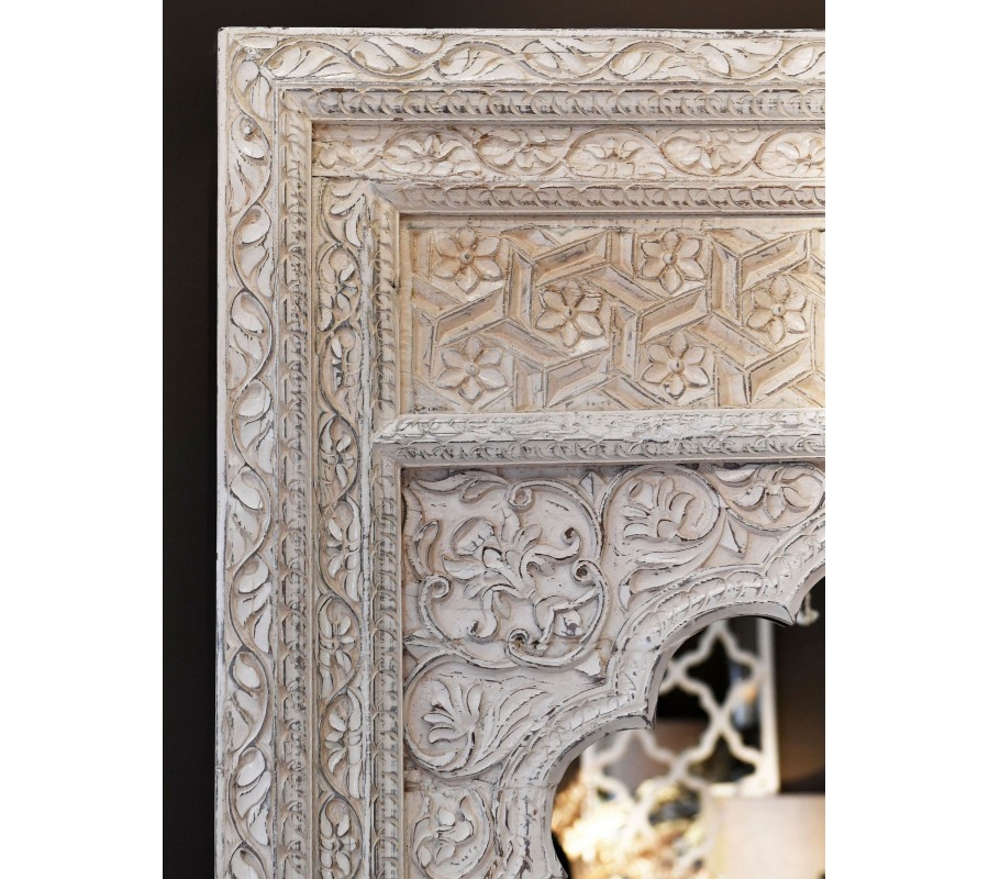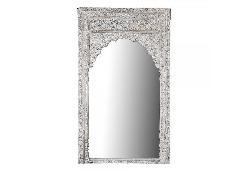 Biele nástenné zrkadlo Agra prináša do interiéru jedinečný šarm vintage a orientálneho štýlu. Obdĺžnikový rám z masívneho mangového dreva vyniká ručne vyrezávanými detailmi, ktoré kombinujú geometrické vzory so zdobenými kvetinovými motívmi a listovými ornamentmi, pričom vnútorný oblúkový výrez dodáva zrkadlu elegantný vzhľad.