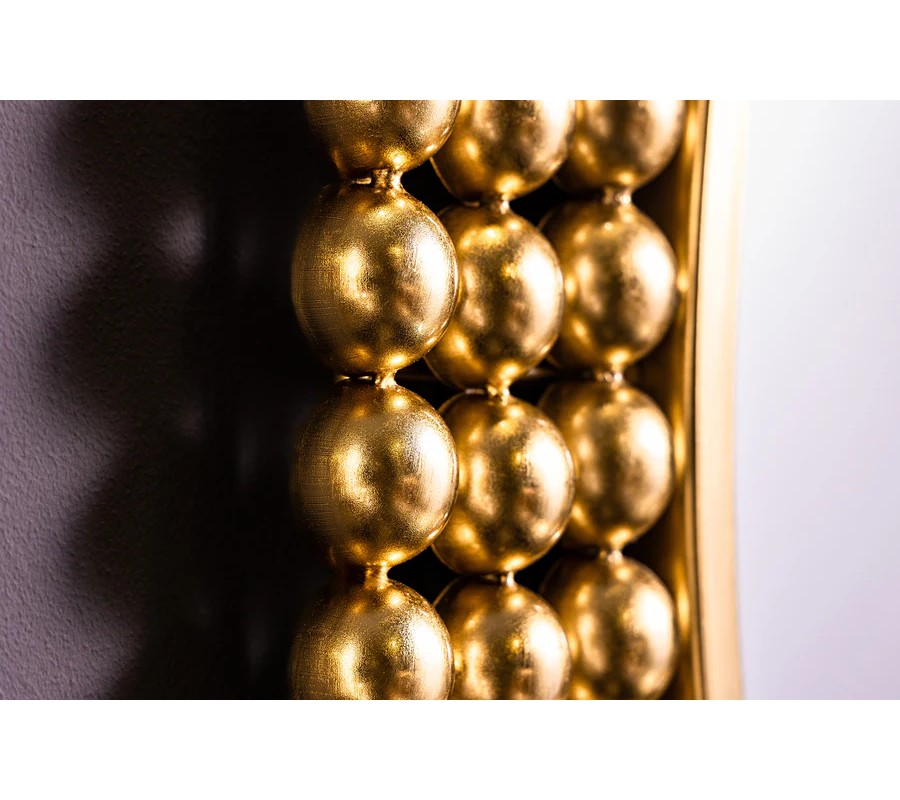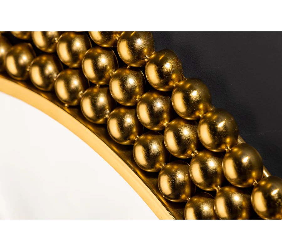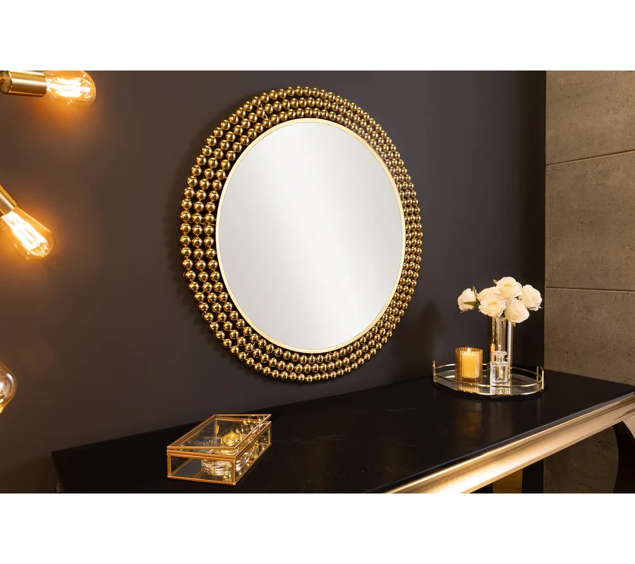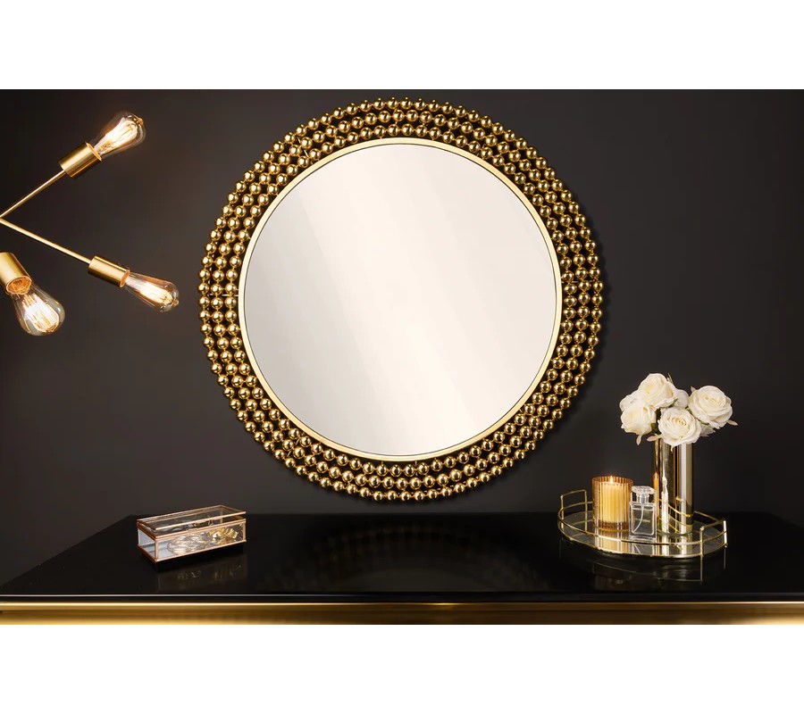 Nástenné zrkadlo Miny s okrúhlym tvarom zaujme svojím výrazným rámom, ktorý je vyrobený z kovu a je tvorený kovovými perlami v zlatej farbe, umiestnenými v troch radoch po obvode zrkadlovej plochy. Jedinečný dizajn rámu pôsobí luxusne a sofistikovane, pričom zlatá farba mu dodáva glamour nádych. Zrkadlová plocha je číra, hladká a perfektne reflektuje svetlo, čím opticky zväčší a presvetlí priestor.