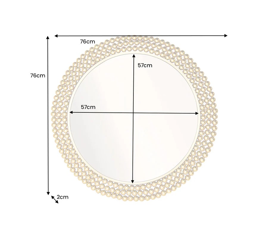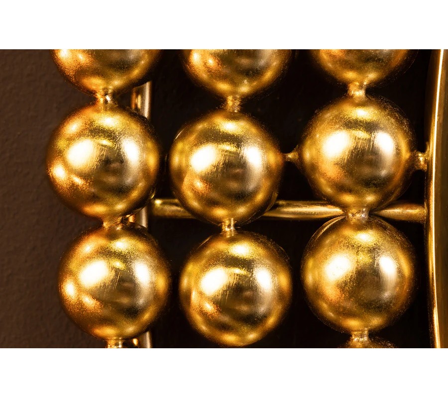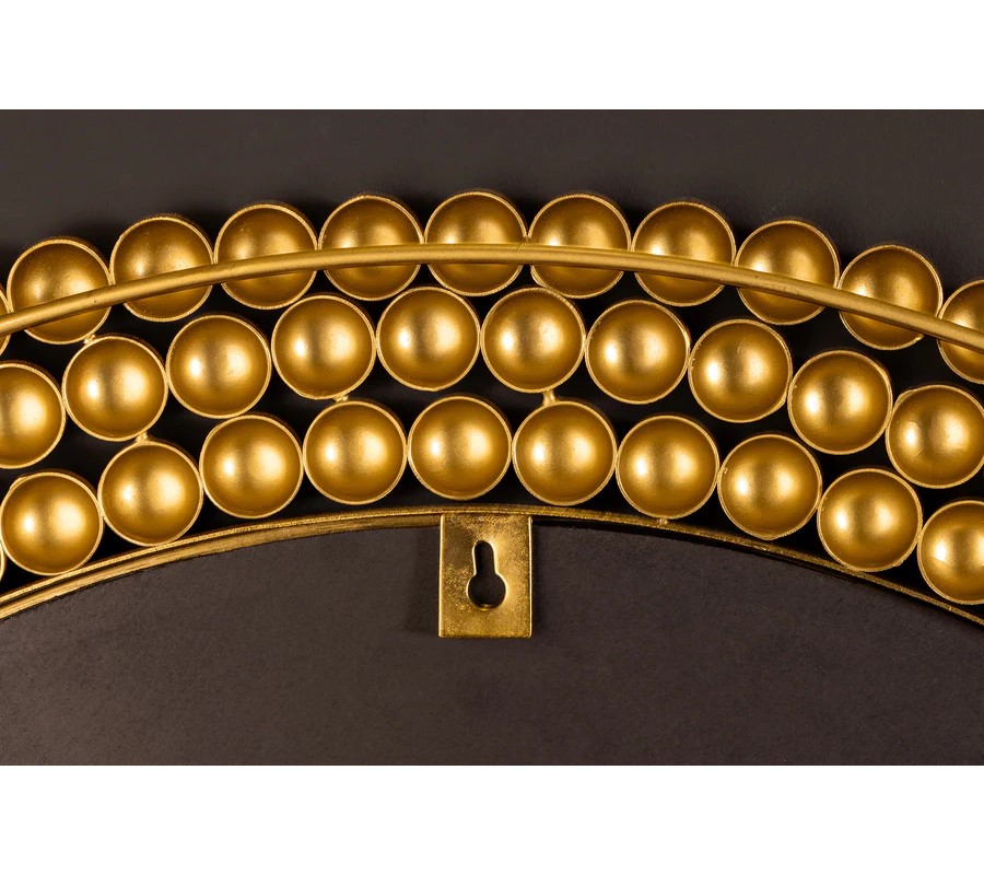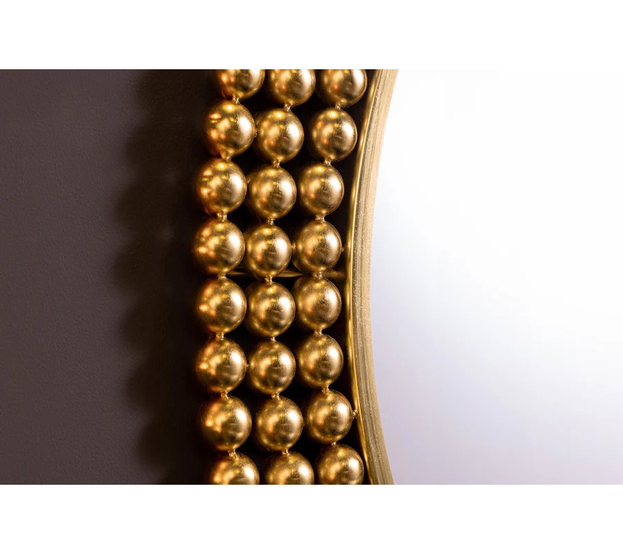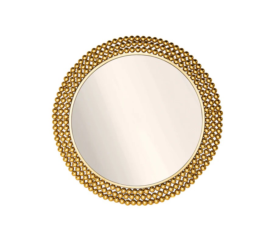 Nástenné zrkadlo Miny s okrúhlym tvarom zaujme svojím výrazným rámom, ktorý je vyrobený z kovu a je tvorený kovovými perlami v zlatej farbe, umiestnenými v troch radoch po obvode zrkadlovej plochy. Jedinečný dizajn rámu pôsobí luxusne a sofistikovane, pričom zlatá farba mu dodáva glamour nádych. Zrkadlová plocha je číra, hladká a perfektne reflektuje svetlo, čím opticky zväčší a presvetlí priestor.