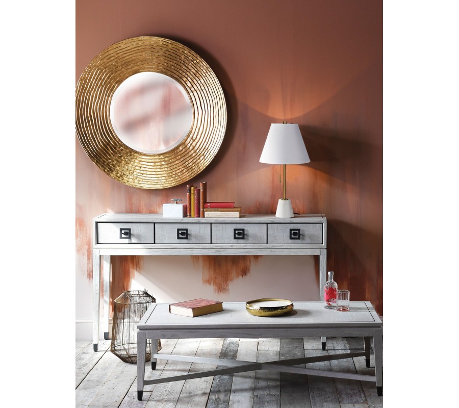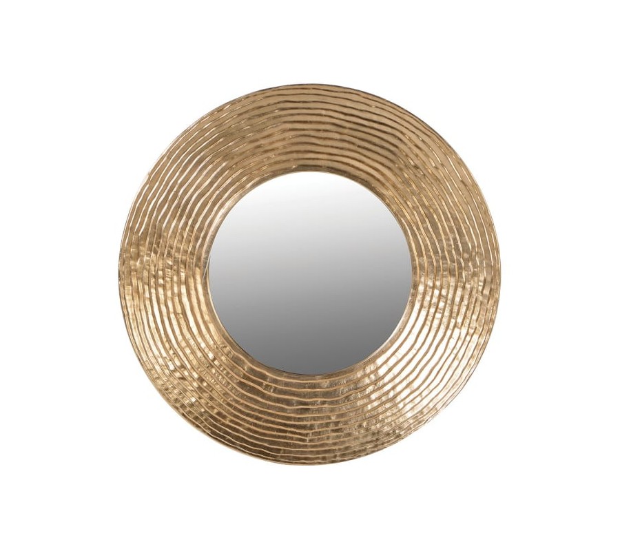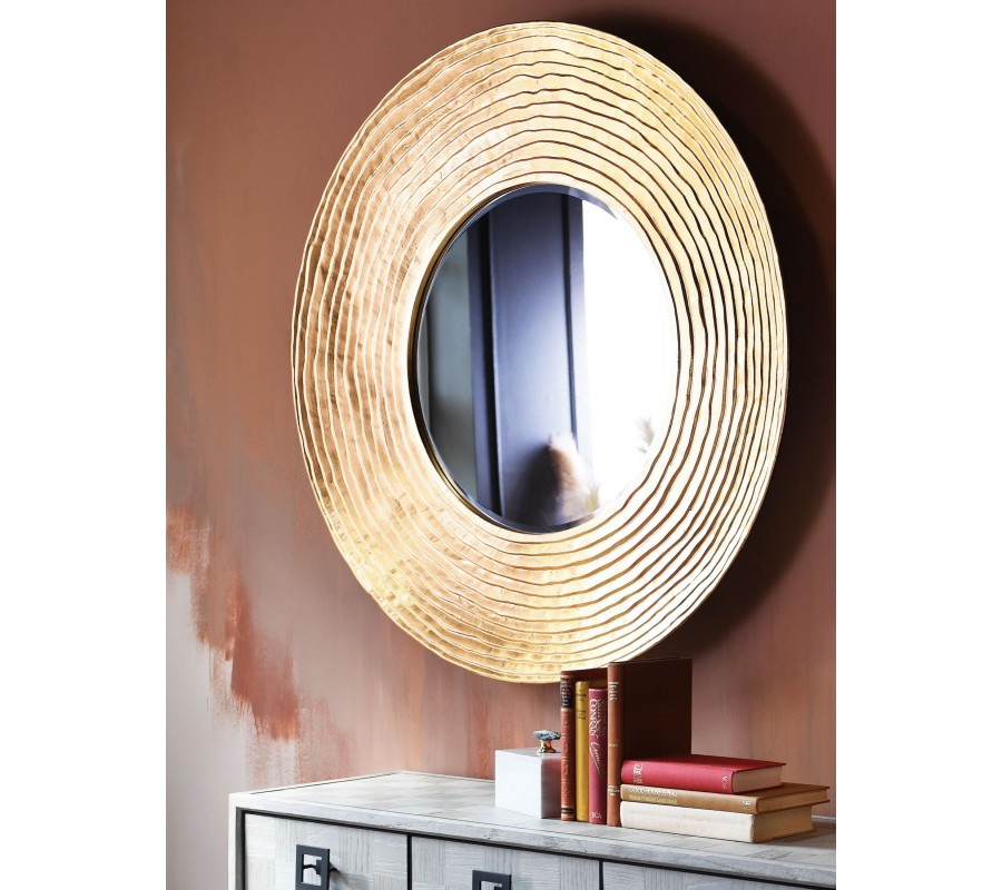 Okrúhle zrkadlo Zania s výrazným rámom, ktorý je štruktúrovaný líniami pripomínajúcimi vrstvenie, pôsobí elegantne a luxusne. Povrch rámu má lesklú zlatú úpravu, ktorá dodáva zrkadlu noblesný charakter a vytvára dojem kovového materiálu. Je navrhnuté v glamour štýle s modernými prvkami, vďaka čomu sa hodí do obývačky, spálne alebo predsiene, kde môže fungovať ako ústredný dizajnový prvok a zároveň opticky zväčšiť priestor. Zrkadlo sa výborne kombinuje s nábytkom a doplnkami v zlatých alebo teplých metalických tónoch, lesklými povrchmi či jemnými textíliami. Skvelo ladí s bielymi alebo krémovými stenami, pričom jeho elegantný vzhľad vynikne v kombinácii so sklenenými doplnkami, svietidlami či dekoračnými predmetmi, ktoré podčiarkujú jeho luxusný štýl.