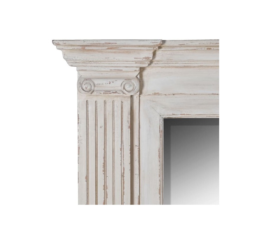 Štruktúra povrchu rámu nesie stopy umelej patiny, ktorá mu dodáva vintage vzhľad. Farba je svetlá, prevažne biela s jemnými odtieňmi krémovej a miestami viditeľným efektom opotrebovania, čo vytvára pocit starobylosti a elegancie. Povrch rámu má jemnú textúru, ktorá zvýrazňuje jeho jedinečný charakter.
