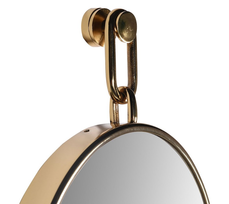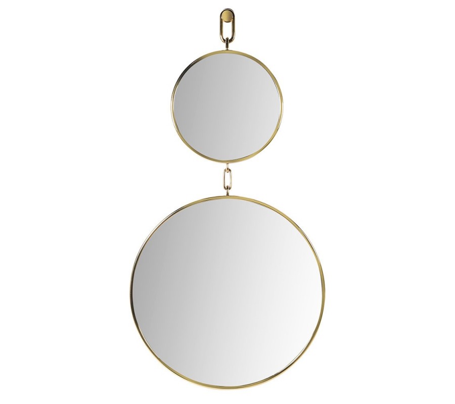 Nástenné závesné zrkadlo Sonia je elegantným doplnkom, ktorý kombinuje glamour a art deco štýl. Skladá sa z dvoch kruhových zrkadiel rôznych veľkostí, ktoré sú osadené v tenkých kovových rámoch vo farbe zlata. Spojenie zrkadiel je zabezpečené pevnými kovovými spojmi, ktoré vytvárajú zaujímavý dizajnový prvok. Zavesenie je riešené prostredníctvom robustného kovového úchytu a zlatého reťazového prvku, ktorý umožňuje jednoduché pripevnenie na stenu a zároveň pôsobí ako dizajnový akcent.