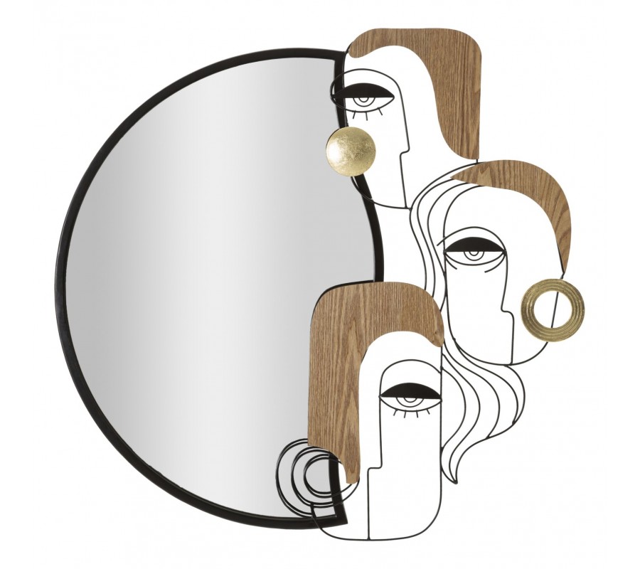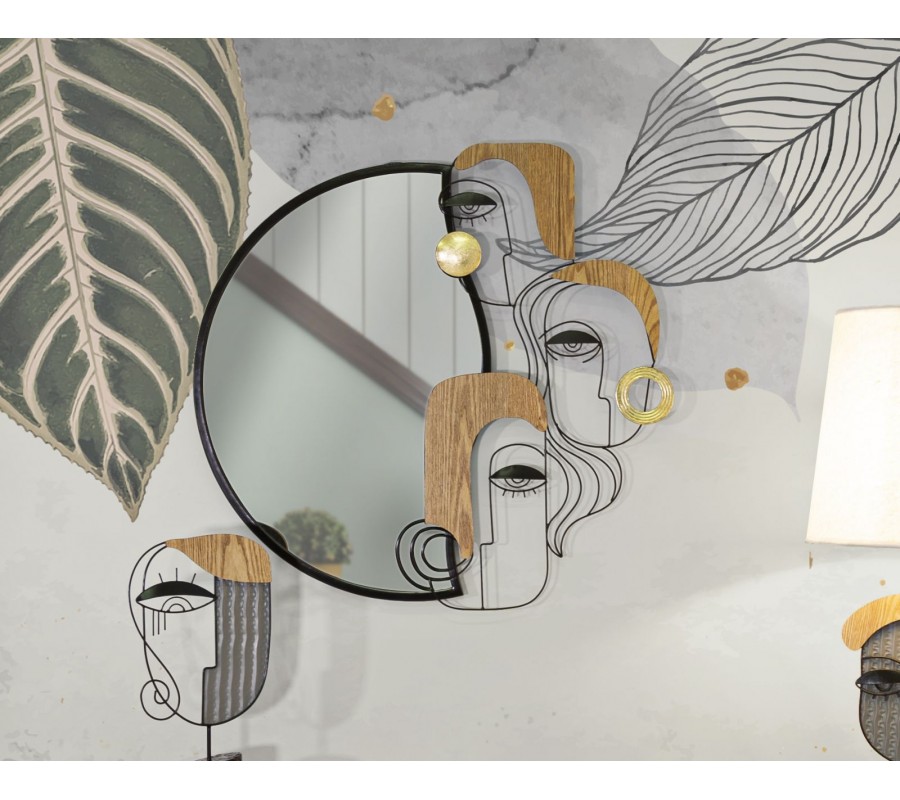 Moderné dizajnové nástenné zrkadlo Donna okrúhleho tvaru s čiernym kovovým rámom a umeleckým dekorom ženských tvárí 80 cm