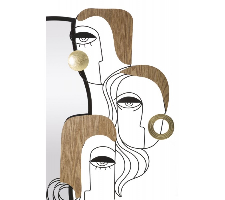 Najvýraznejším prvkom je abstraktný reliéf troch ženských tvárí, ktorý čerpá inšpiráciu z avantgardného umenia. Kovové kontúry tvárí sú doplnené drevenými a kovovými prvkami, čím vytvárajú vrstvený efekt a pridávajú hĺbku celkovému dizajnu. Táto kombinácia materiálov a farieb vytvára dynamický vizuálny dojem.