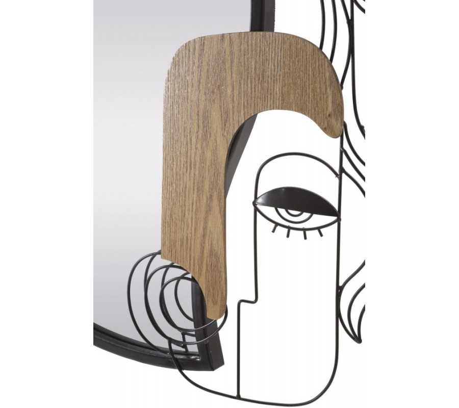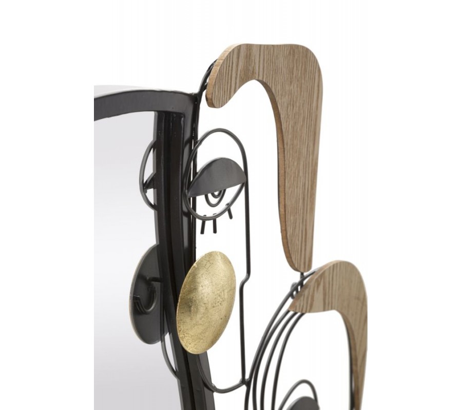 Zrkadlo Donna je jedinečný umelecký prvok, ktorý v sebe spája funkčnosť a moderný dizajn. Okrúhly zrkadlový povrch je asymetricky doplnený o dekoratívne prvky, čím vzniká zaujímavá kompozícia, ktorá pôsobí ako súčasť umeleckého diela. Čierny kovový rám dodáva zrkadlu industriálny nádych, zatiaľ čo hnedé drevené a zlaté kovové detaily zdôrazňujú jeho sofistikovaný vzhľad.