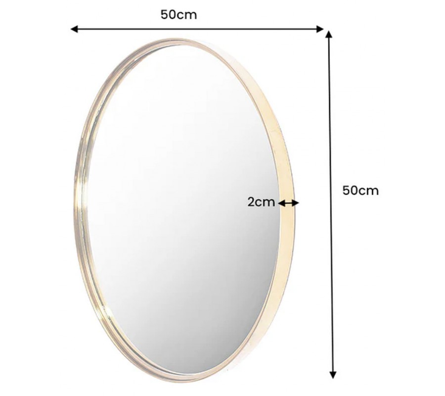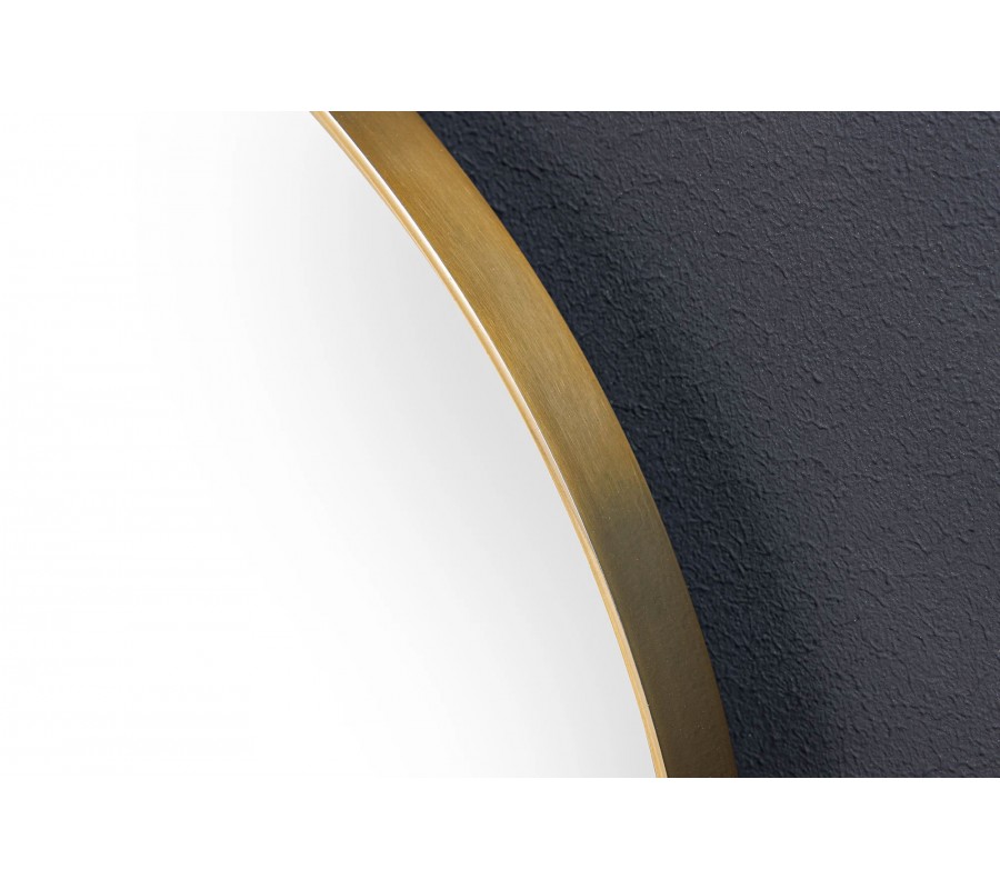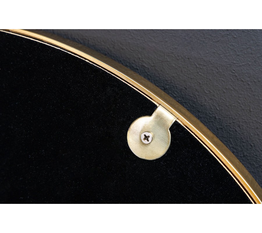 Rám je vyrobený z ocele, ktorá zaručuje vysokú stabilitu a odolnosť. Povrchová úprava v zlatom tóne podčiarkuje sofistikovaný charakter zrkadla. Rám je hladký a mierne vyvýšený nad zrkadlovú plochu, čo vytvára vizuálnu hĺbku. Zadná časť obsahuje háčik na jednoduché zavesenie na stenu.