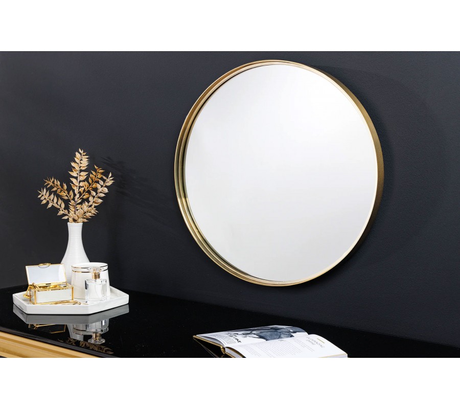 Okrúhle nástenné zrkadlo Keening je dokonalým doplnkom pre interiéry v glamour a art deco štýle. Jeho tenký kovový rám v zlatej farbe dodáva priestoru elegantný vzhľad a zároveň vytvára luxusnú atmosféru.