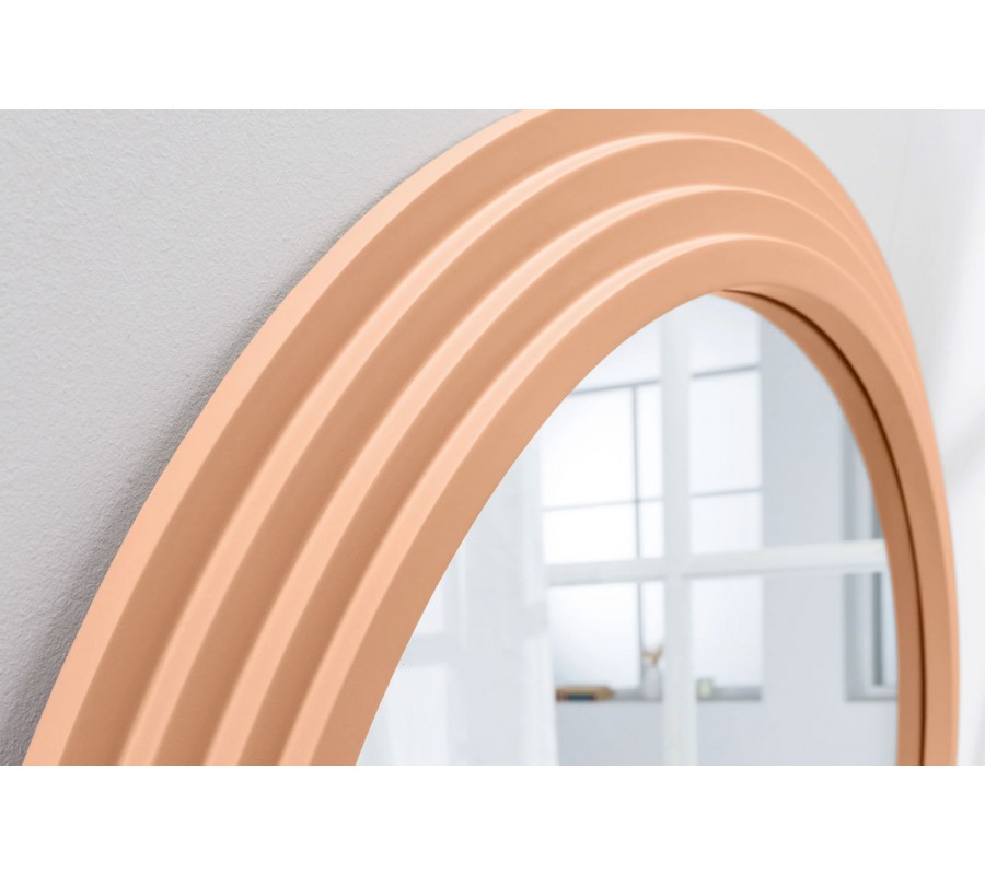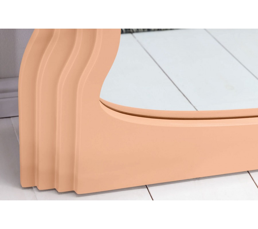 Dizajnové nástenné zrkadlo Swan v art deco štýle okamžite upúta svojím oblúkovým rámom s vlnitými okrajmi, ktoré vytvárajú harmonický a plynulý dizajn. Rám je doplnený o vrstvené, schodíkovité detaily, ktoré umocňujú jeho dekoratívny vzhľad a dodávajú mu hĺbku. Jemná marhuľová farba rámu pôsobí sofistikovane a vnáša do interiéru teplo a útulnosť. Rám je vyrobený z kovu, ktorý dodáva zrkadlu pevnosť a odolnosť. Na zadnej strane sa nachádzajú úchytky na jednoduché upevnenie na stenu.
