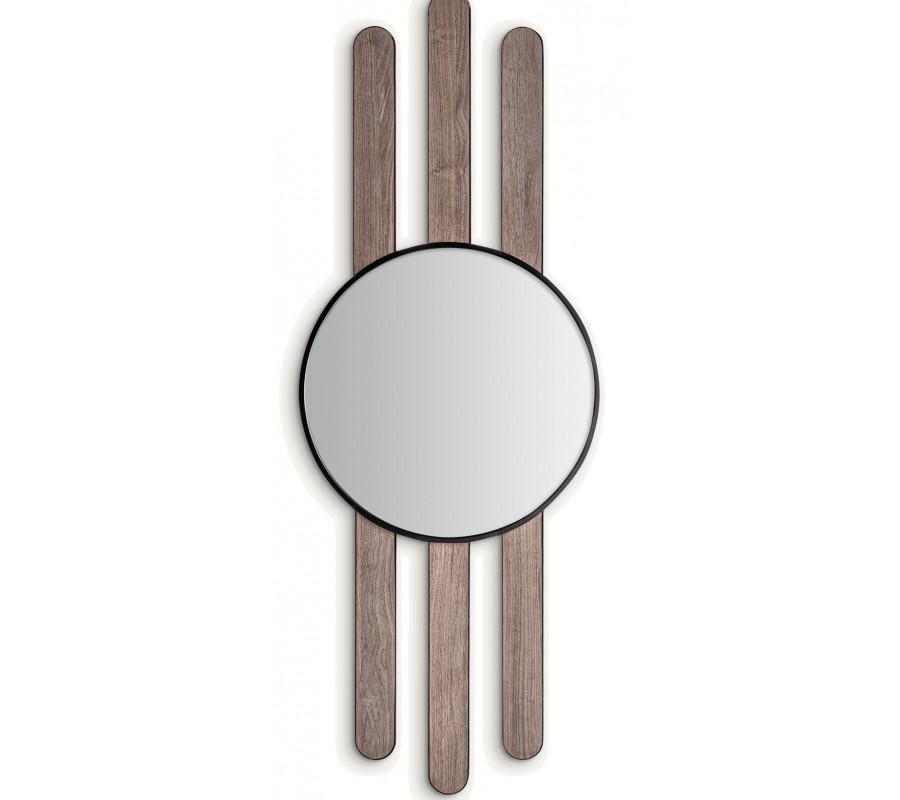 Nástenné závesné zrkadlo Missy v art deco a glamour štýle je dizajnový kúsok, ktorý kombinuje eleganciu kovu a prírodnú krásu dreva. Okrúhle zrkadlo je orámované tenkým čiernym kovovým rámom, ktorý mu dodáva decentný a moderný vzhľad. Jeho výnimočnosť spočíva v masívnej drevenej dekorácii v hnedej farbe, ktorá pozostáva z troch vertikálne umiestnených dosiek s oblými hranami.