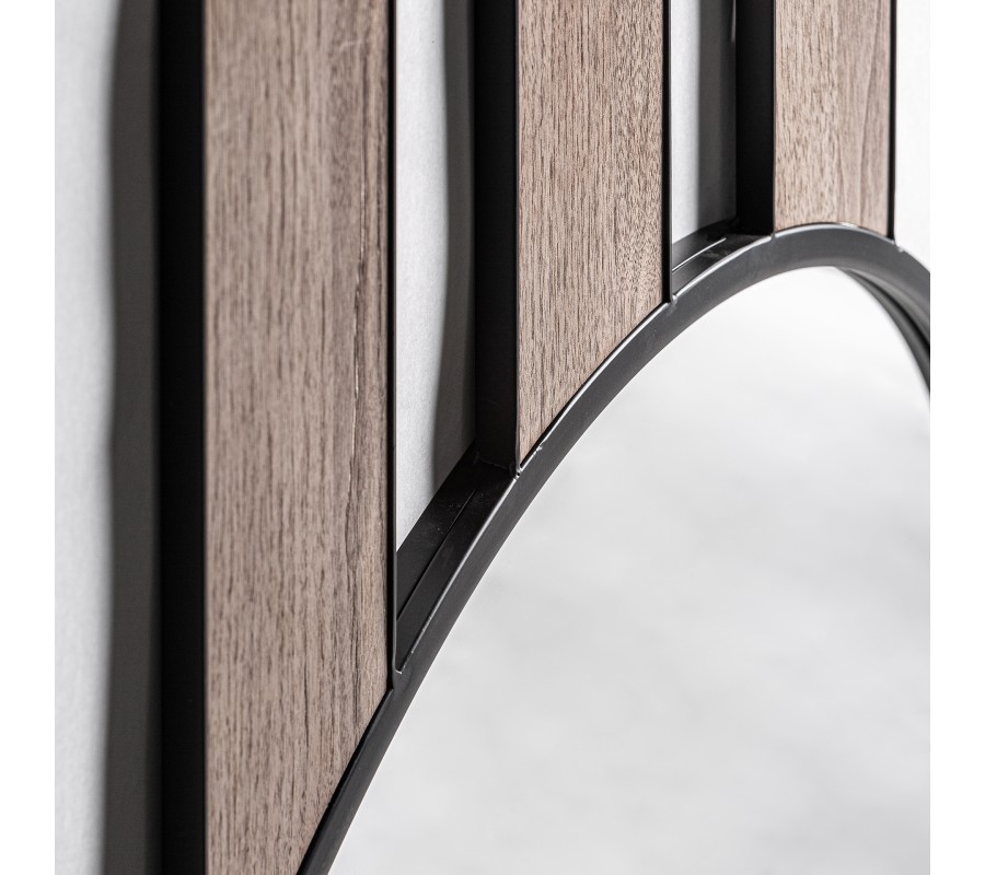 Art deco nástenné okrúhle masívne zrkadlo Missy s čiernym kovovým rámom a hnedým dreveným dekorom 222 cm