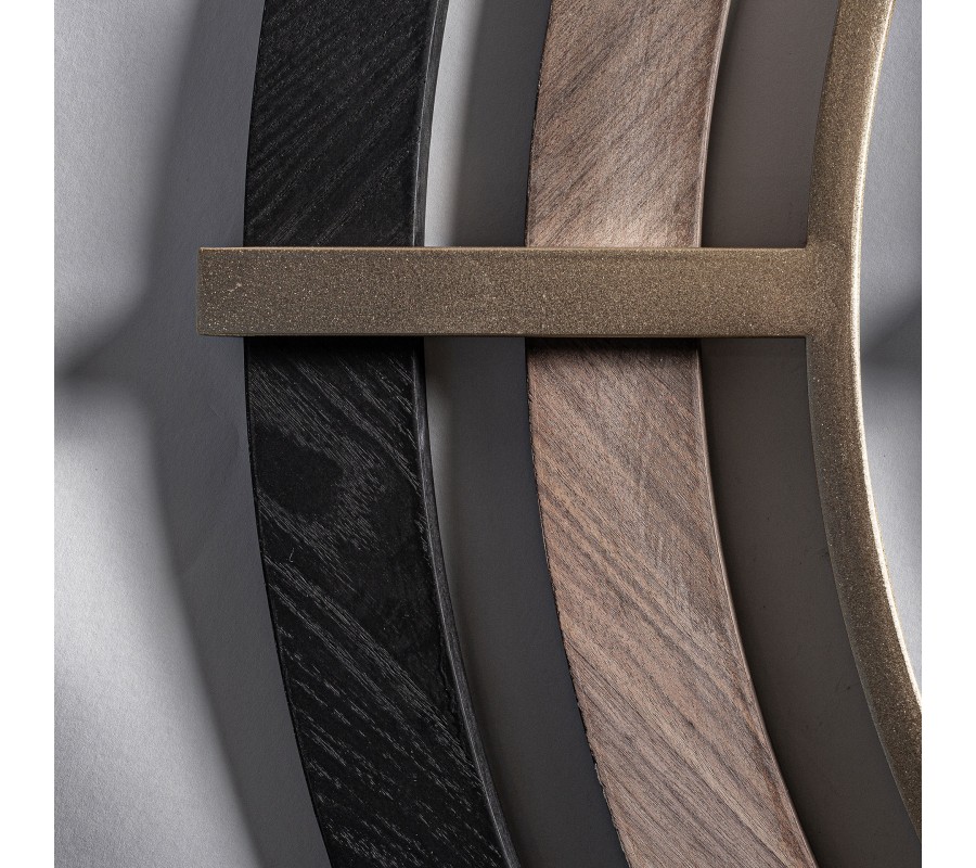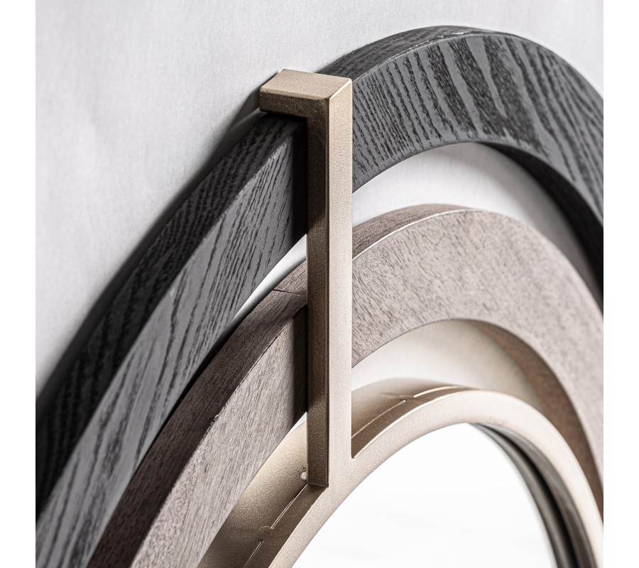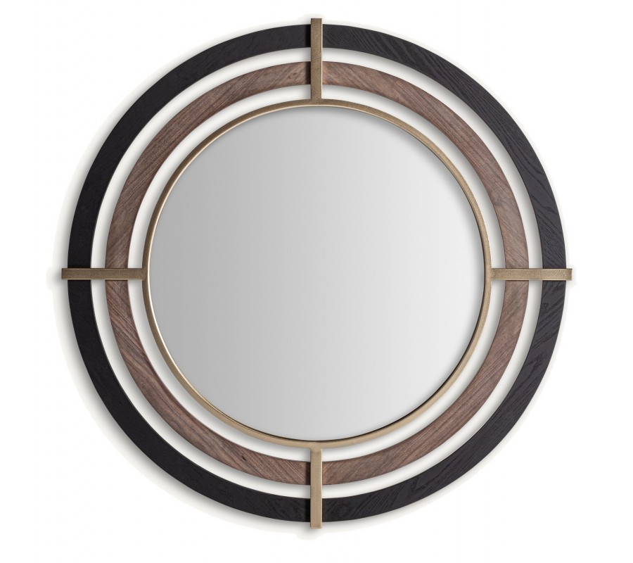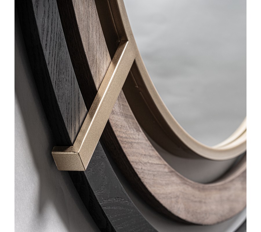 Nástenné závesné zrkadlo Missy v art deco a glamour štýle je luxusný dekoratívny prvok, ktorý spája eleganciu kovu s teplým vzhľadom dreva. Okrúhly tvar je zdôraznený trojvrstvovým rámom v kontrastných farbách a materiáloch, čím vytvára výrazný vizuálny efekt.