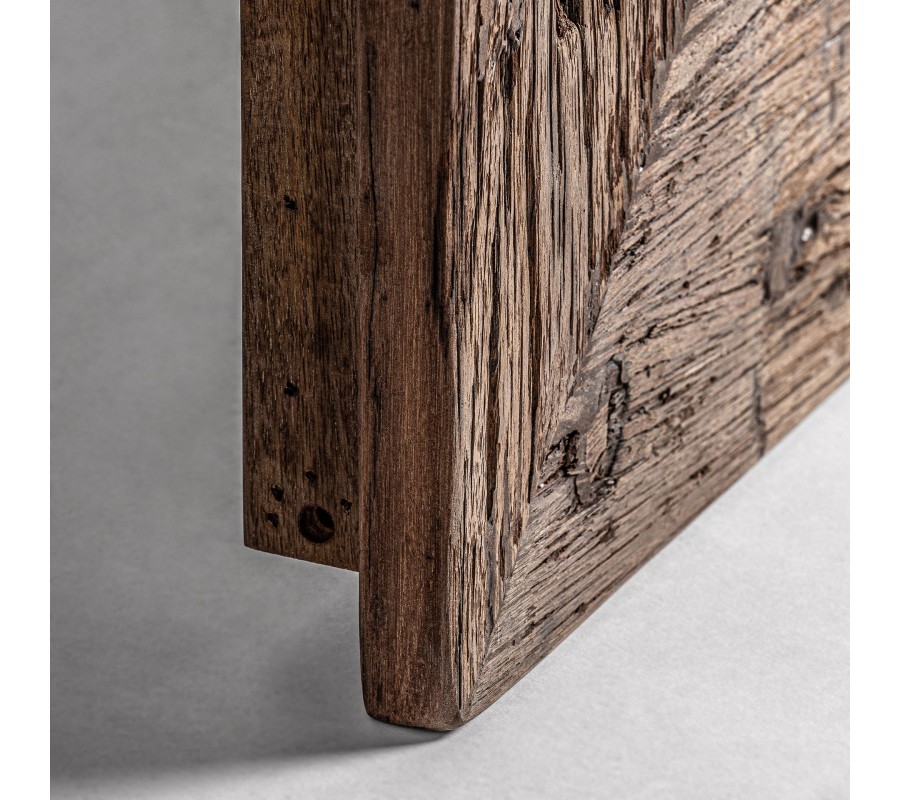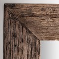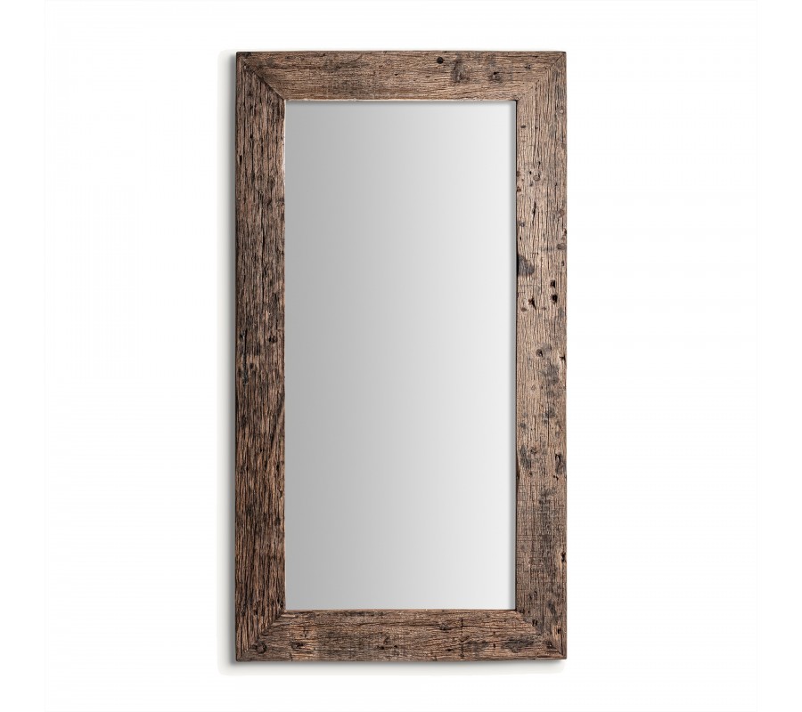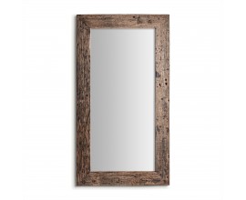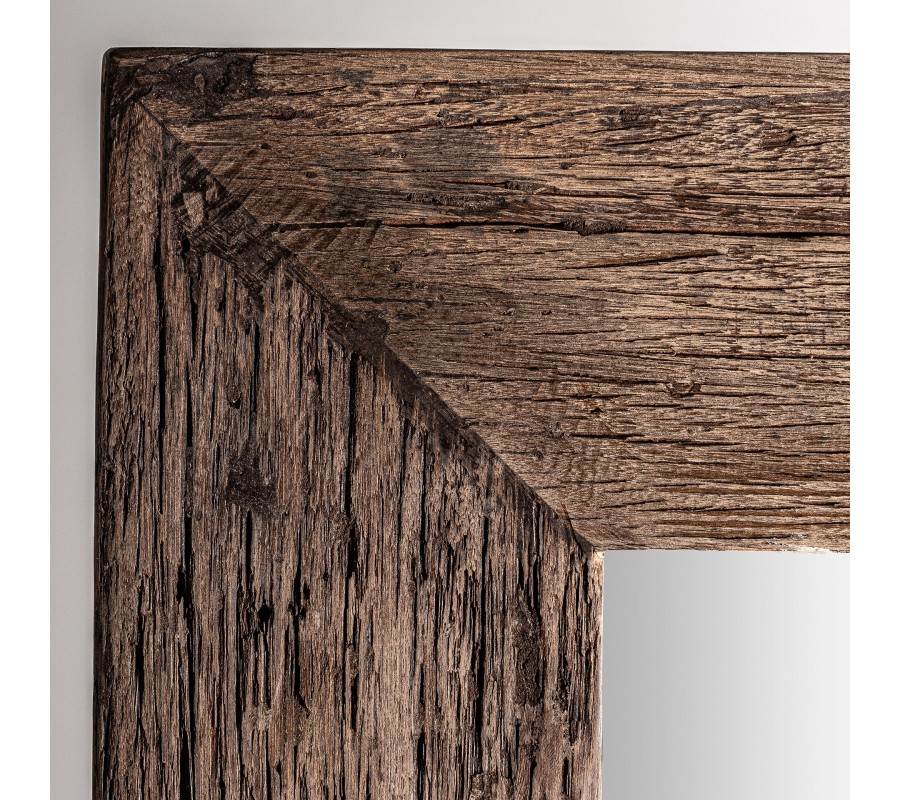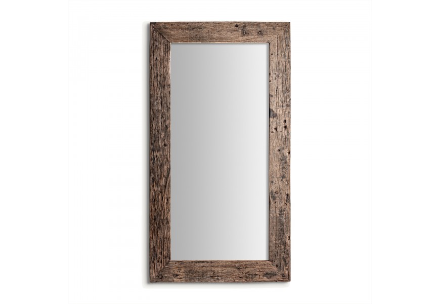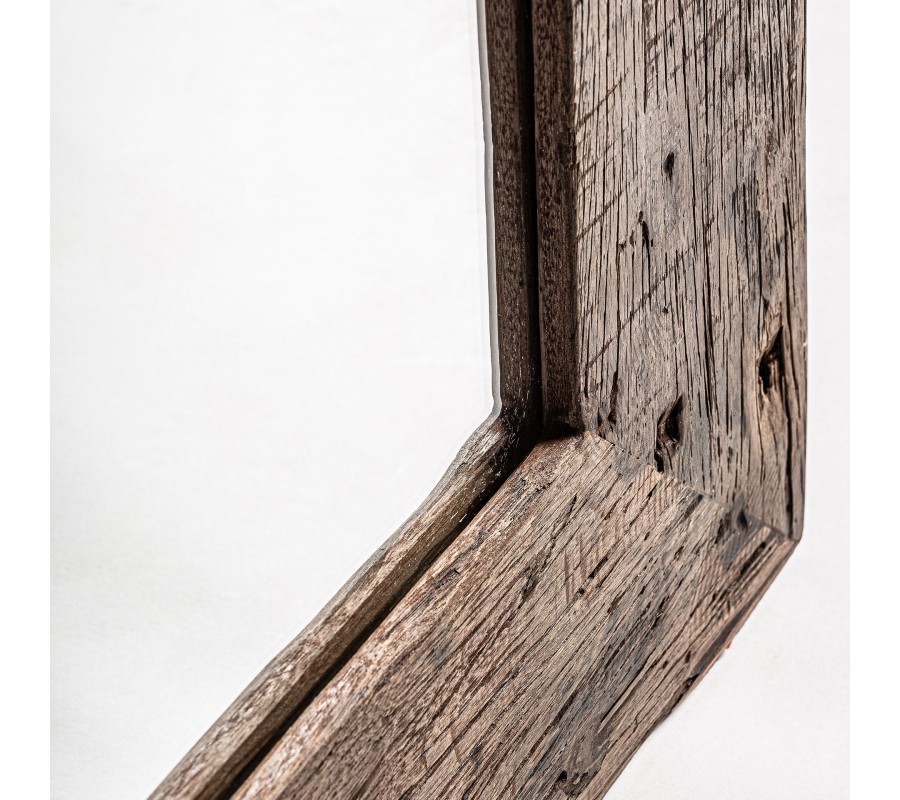 Luxusné rustikálne závesné zrkadlo Larena v obdĺžnikovom tvare zaujme rámom z masívneho recyklovaného dreva v hnedej farbe, ktorý vyniká výraznou štruktúrou letokruhov, prírodnými prasklinami a drobnými nedokonalosťami typickými pre surové drevo. Nelakovaný povrch zachováva autentický charakter materiálu, pričom drobné nerovnosti a viditeľné póry dodávajú zrkadlu jedinečný vzhľad.
