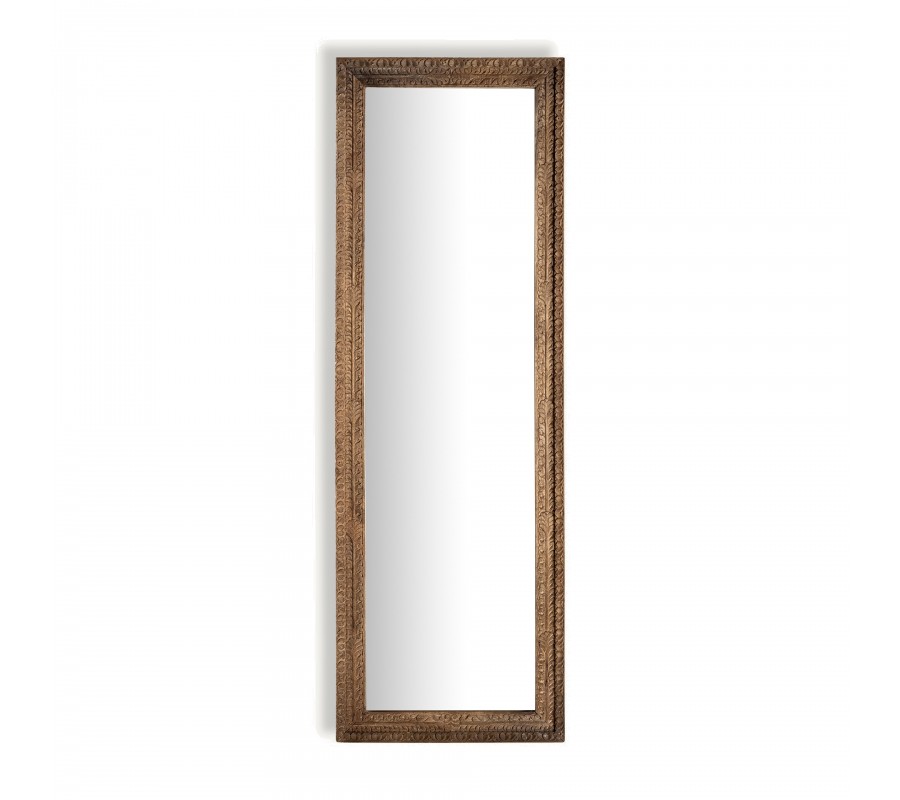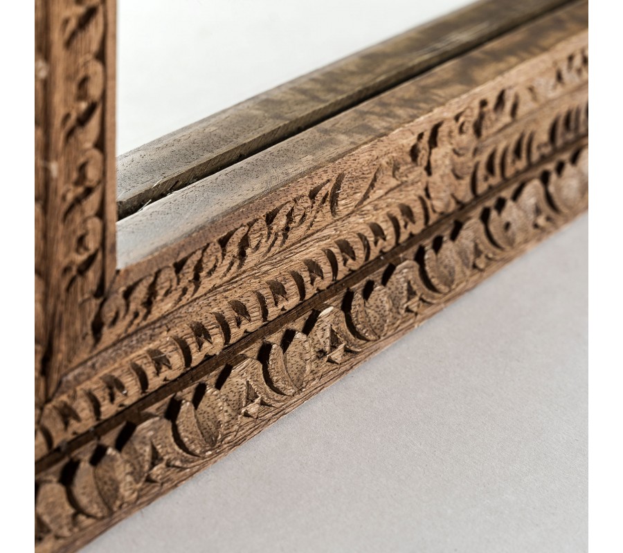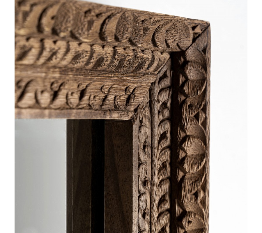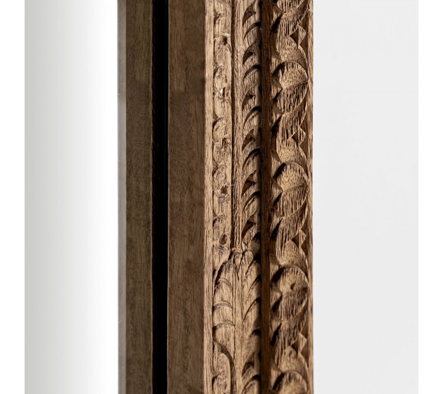 Luxusné vidiecke zrkadlo Trevor s retro črtami zaujme svojím obdĺžnikovým tvarom a bohatým rámom z masívneho mangového dreva v prírodnej hnedej farbe s jemným matným povrchom, ktorý zvýrazňuje kresbu letokruhov a rustikálny charakter dreva. Rám je zdobený dekoratívnym vyrezávaním, ktoré sa tiahne po celom obvode a vytvára súvislý ornamentálny motív s jemnými oblúkmi a rytmickým reliéfom.