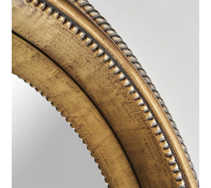Luxusné závesné zrkadlo Malisa vyniká okrúhlym tvarom a bohato dekorovaným rámom, ktorý je vyrobený zo živice s detailným vyrezávaným vzorom v štýle art deco s jemným vintage nádychom. Povrch rámu je upravený do elegantnej zlatej farby s patinou, ktorá mu dodáva autentický starožitný vzhľad. Zrkadlová plocha je hladká, obkolesená plastickými výstupkami a rytinami po celom obvode, ktoré pripomínajú klasickú remeselnú prácu.