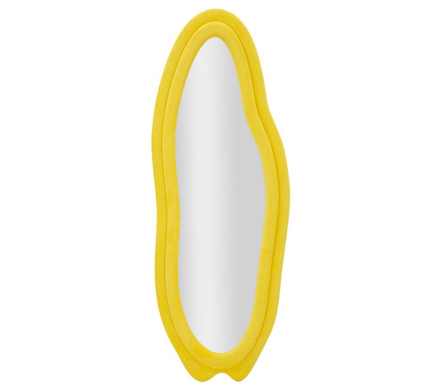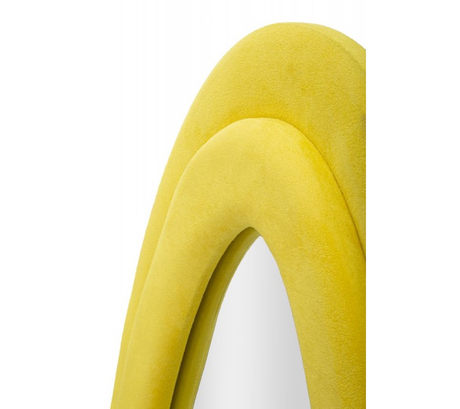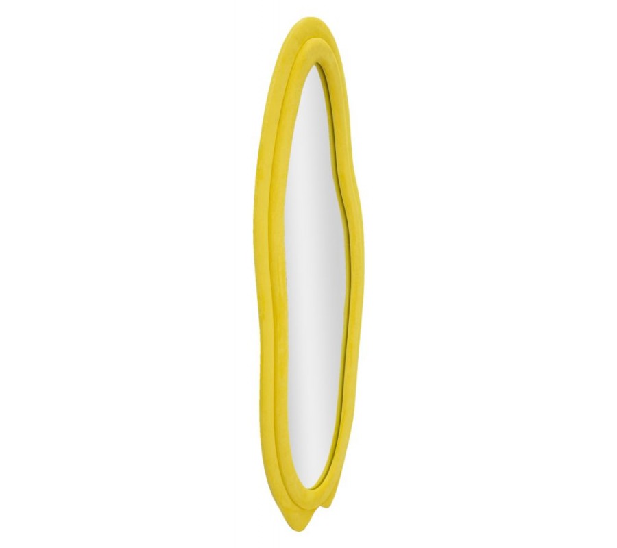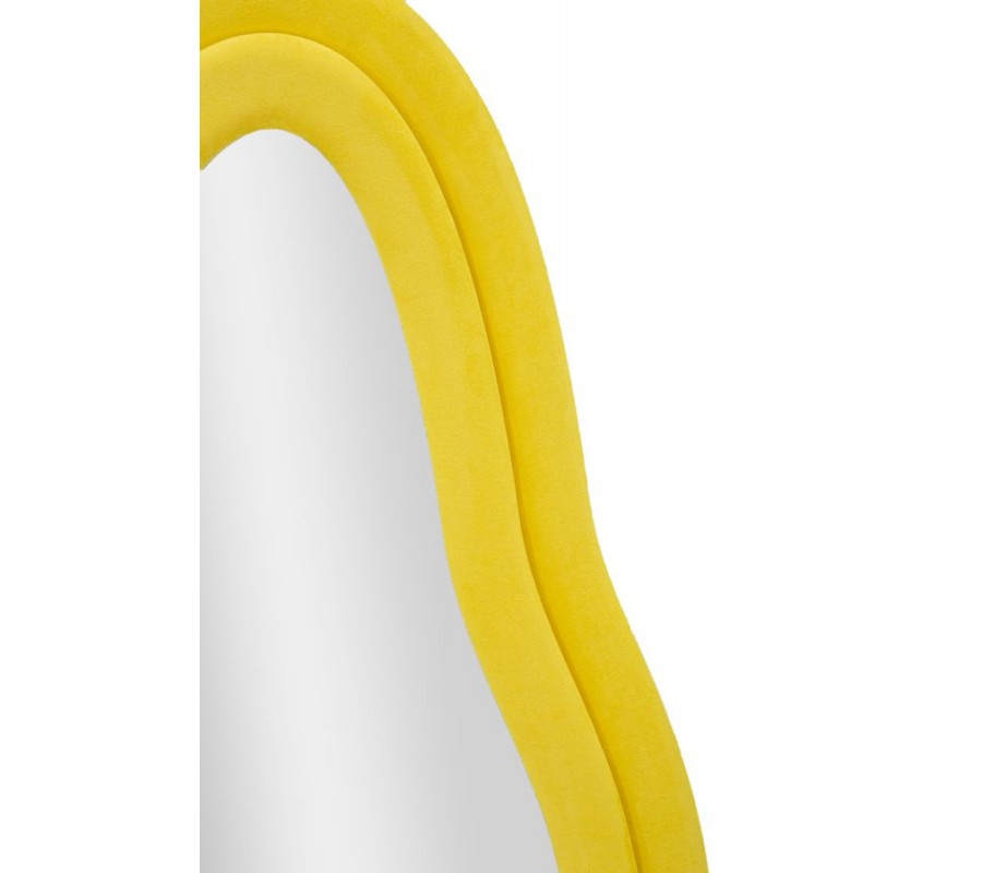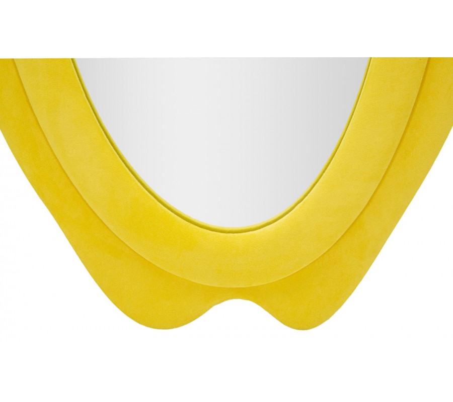 Zrkadlo Wavey pôsobí ako umelecký objekt – jeho originálny nepravidelný vlnitý tvar evokuje prírodné línie a pohyb vody, čím vnáša do interiéru hravosť a vizuálnu dynamiku. Dvojitý rám zrkadla vytvára zaujímavý hĺbkový efekt, ktorý zvýrazňuje jeho tvar a robí z neho pútavý stredobod miestnosti. Poťah rámu je zhotovený z jemného semišovo zamatového materiálu v jasne žltom odtieni, ktorý zrkadlu dodáva mäkký lesk a moderný, energický výraz.
