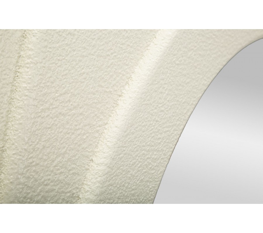 Zrkadlo Landa upúta svojím organickým asymetrickým tvarom a vrstveným rámom s vlnitým dizajnom, ktorý pripomína prirodzené línie reliéfu alebo plynulý pohyb vody. Zrkadlová plocha je oválna, jemne zapustená do rámu, čo zvýrazňuje jej centrálnu polohu a zvyšuje estetický dojem. Povrch rámu má jemne štruktúrovaný náter, ktorý zvyšuje vizuálnu hĺbku a zároveň dodáva zrkadlu remeselný charakter.