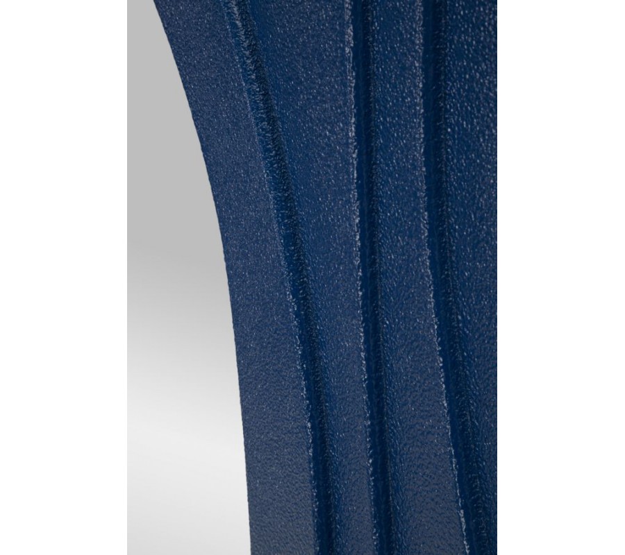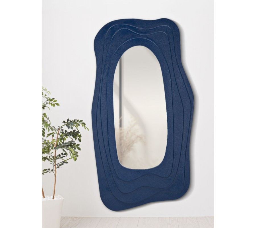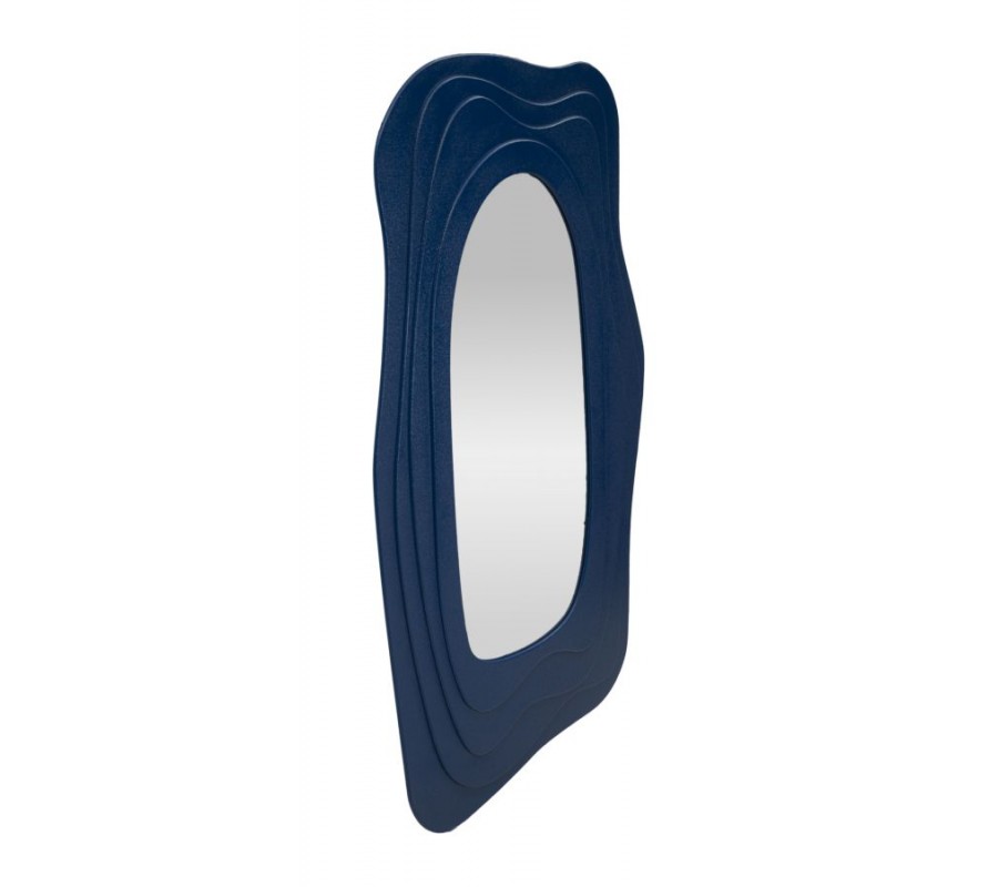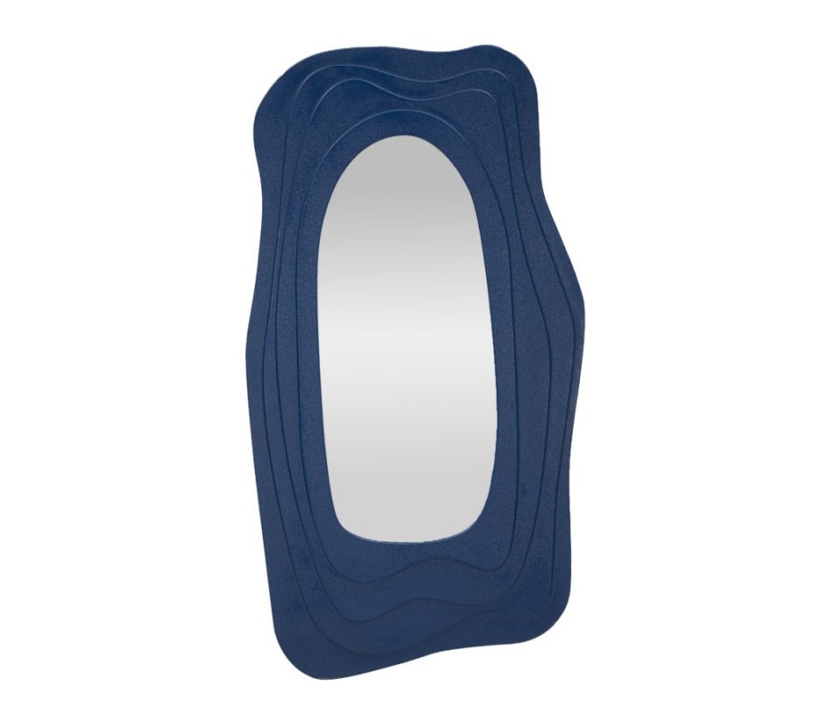 Zrkadlo Landa je výrazným dizajnovým prvkom s originálnym organickým tvarom, ktorý pripomína prirodzené terénne línie alebo plynulý pohyb vody. Jeho viacvrstvový rám z dyhovaného dreva v sýtej námorníckej modrej farbe vytvára zaujímavý hĺbkový efekt, ktorý v priestore pôsobí výtvarne a dodáva mu štruktúru aj dynamiku. Zrkadlová plocha má oválny tvar, jemne zapustený do rámu.