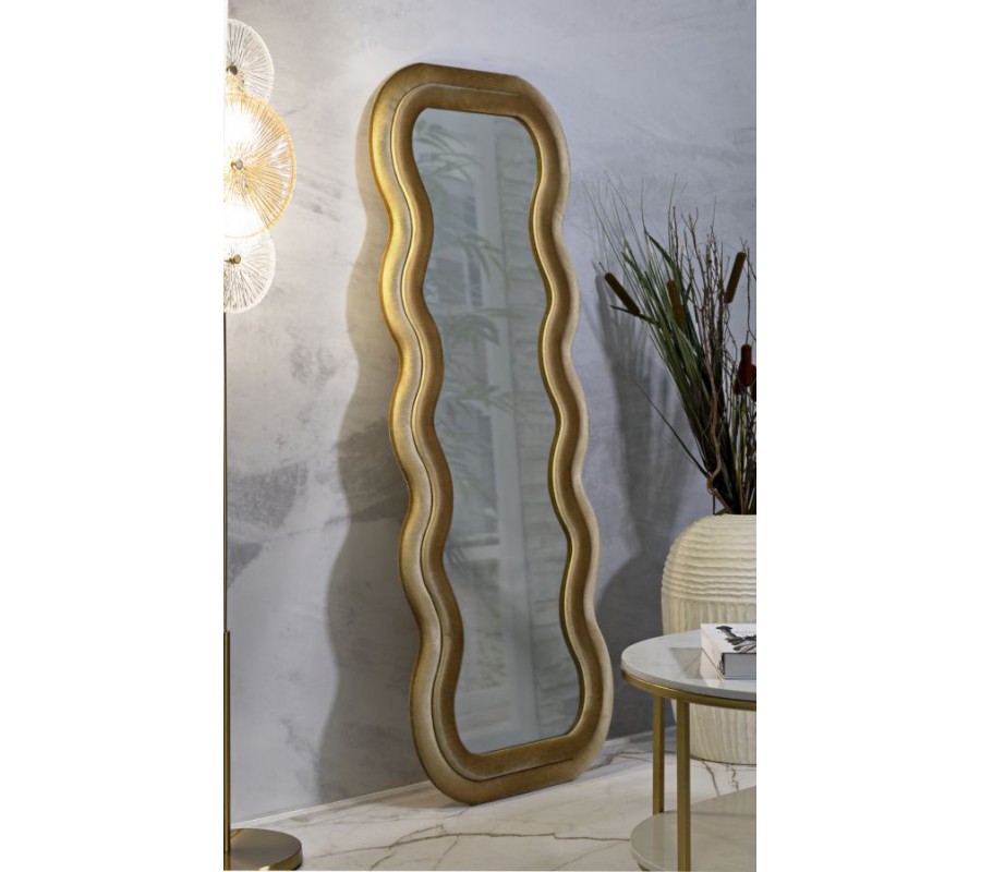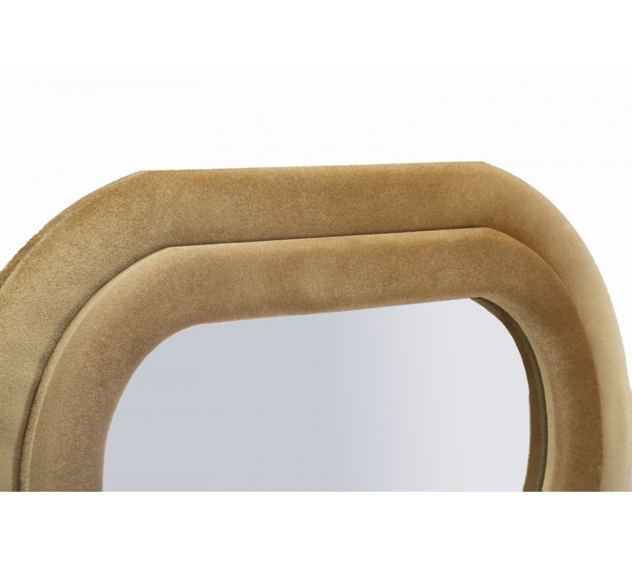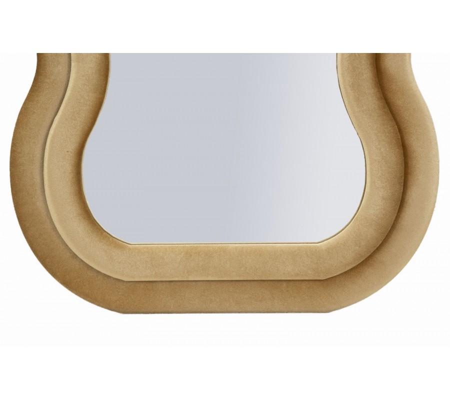 Zrkadlo Swan prináša do interiéru harmonickú kombináciu mäkkých kriviek, príjemného materiálu a funkčného dizajnu. Jeho obdĺžnikový formát je ozvláštnený plynulým vlnitým obrysom, ktorý pôsobí dynamicky a zároveň elegantne. Dvojitý rám je potiahnutý jemným zamatovým poťahom v béžovej farbe, ktorá pôsobí mäkko, teplo a decentne. Rovnaký poťah sa nachádza aj na zadnej strane, čo zrkadlu dodáva dokončený a ucelený vzhľad.