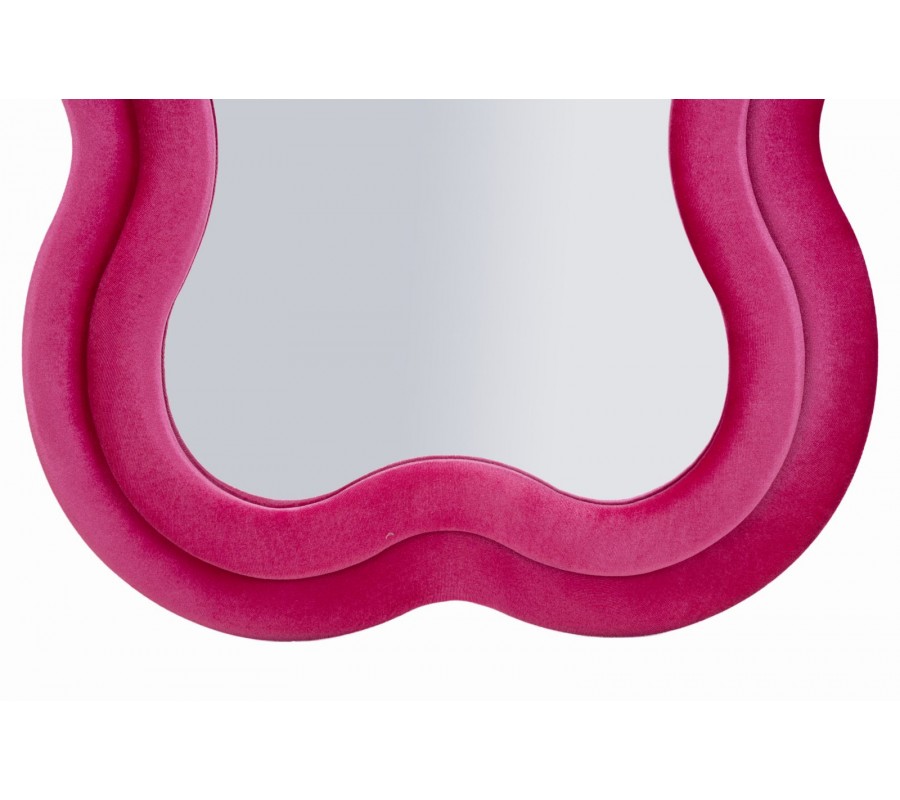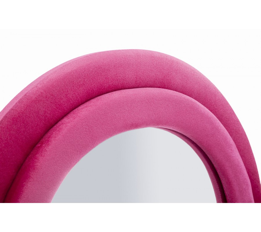 Celý rám je čalúnený ružovým semišovo zamatovým poťahom, ktorý pôsobí mäkko, luxusne a dodáva zrkadlu elegantný lesk a vizuálnu hĺbku. Jeho konštrukcia má dyhovaný povrch, čo zaručuje pevnosť, stabilitu a kvalitné spracovanie, typické pre dizajnový nábytok vyššej triedy.