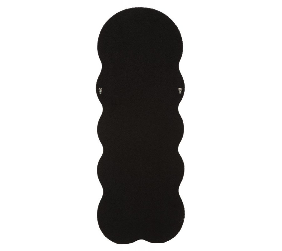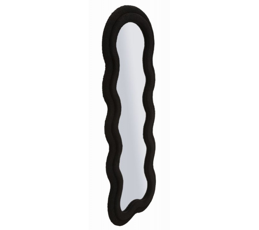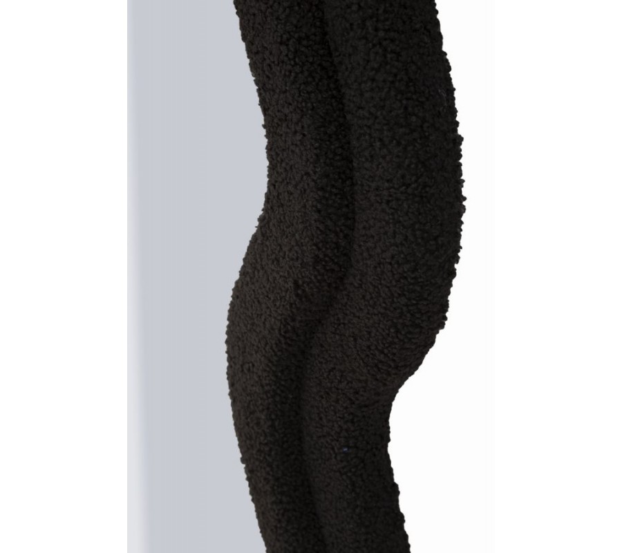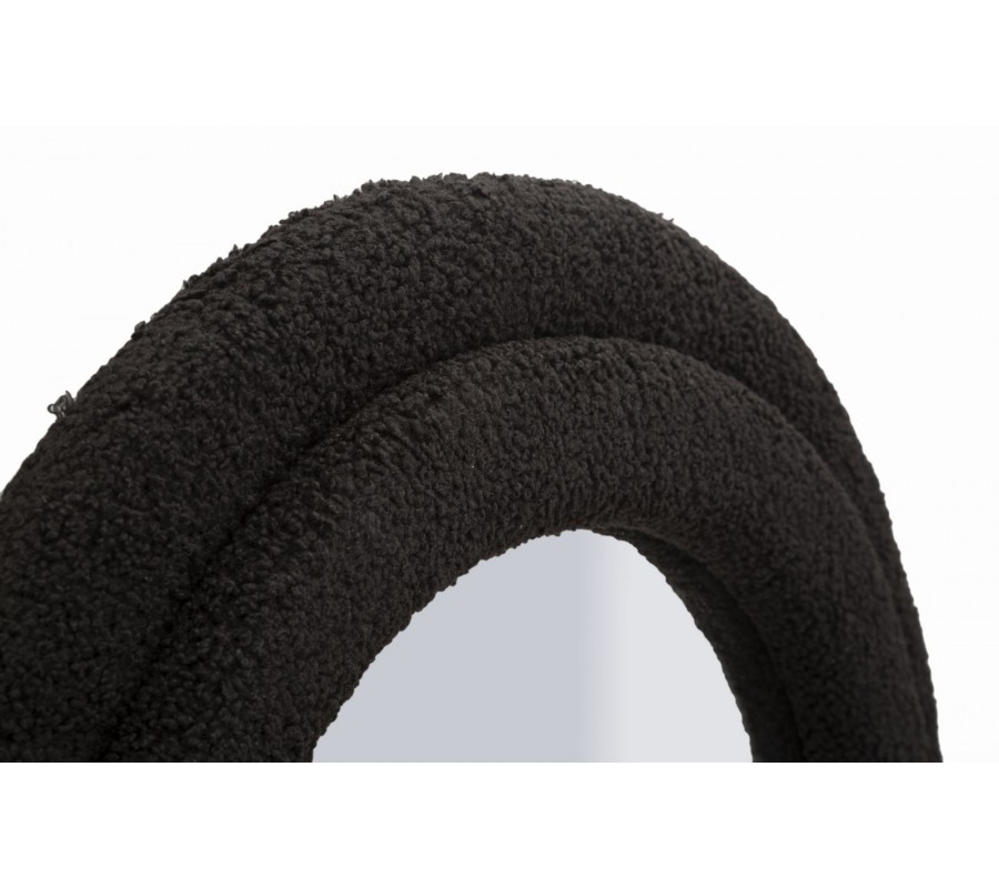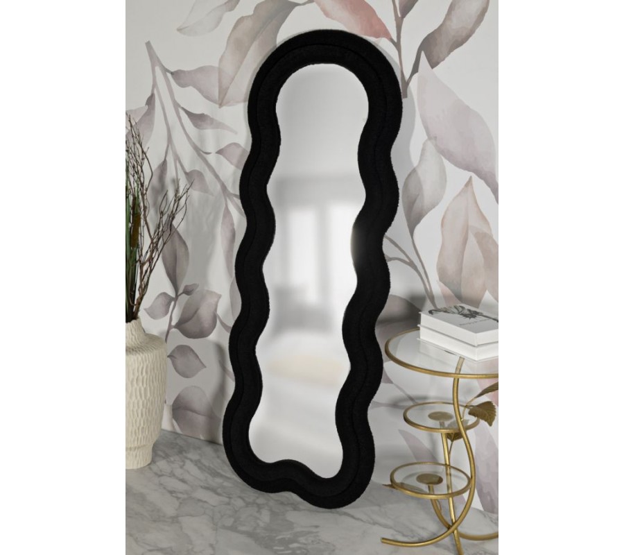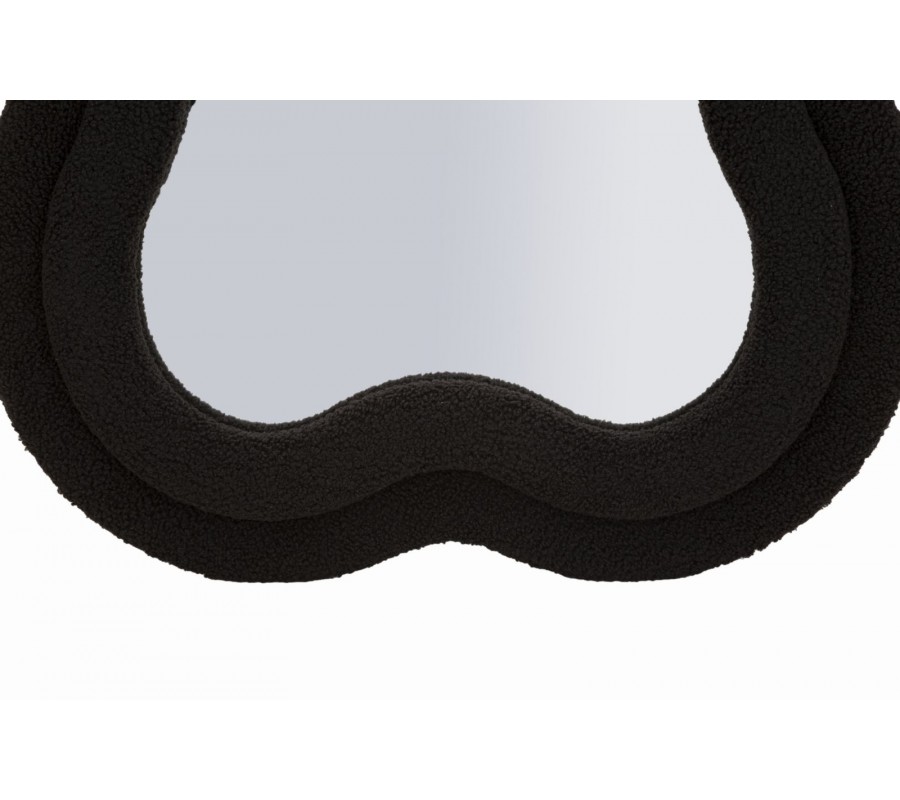 Dvojitý rám zrkadla je potiahnutý kvalitným čiernym bouclé poťahom, ktorý v kombinácii s dynamickým tvarom pôsobí luxusne, dramaticky a elegantne. Poťah pokračuje aj na zadnú stranu rámu, čím zvýrazňuje precízne spracovanie a estetickú hodnotu z každého uhla pohľadu.