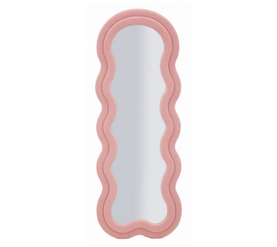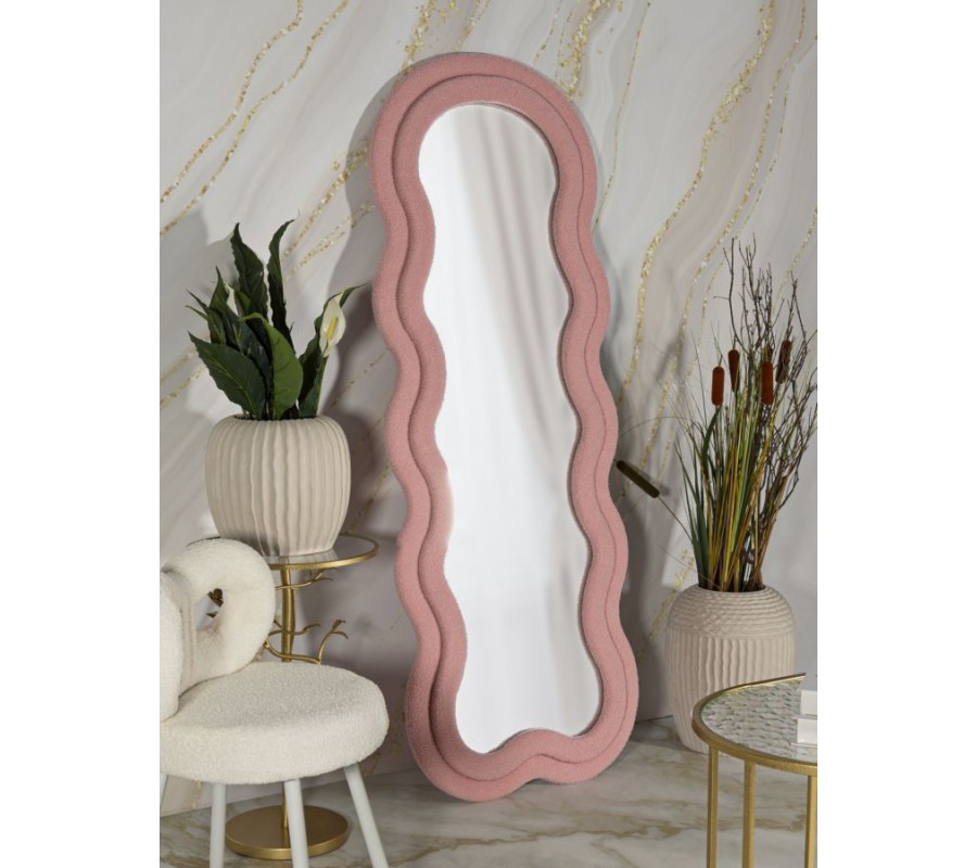 Dizajnové ružové zrkadlo Swan s jemne vlnitým rámom a zaobleným horným oblúkom s bouclé poťahom 160 cm