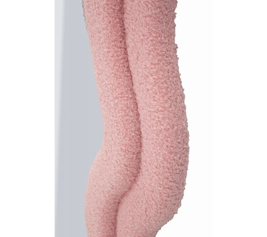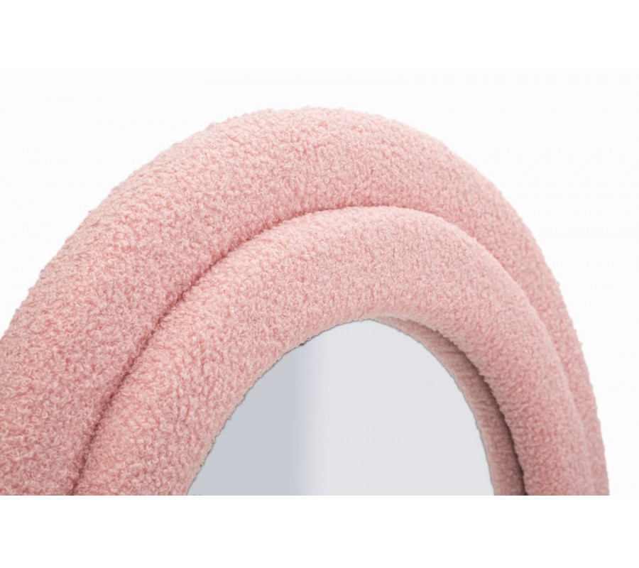 Dvojitý rám je potiahnutý jemne štruktúrovaným bouclé poťahom v svetloružovej farbe, ktorý pôsobí vizuálne aj na dotyk príjemne. Poťah prechádza aj na zadnú stranu rámu, čím zvýrazňuje dôsledné a kvalitné remeselné spracovanie z každého pohľadu.