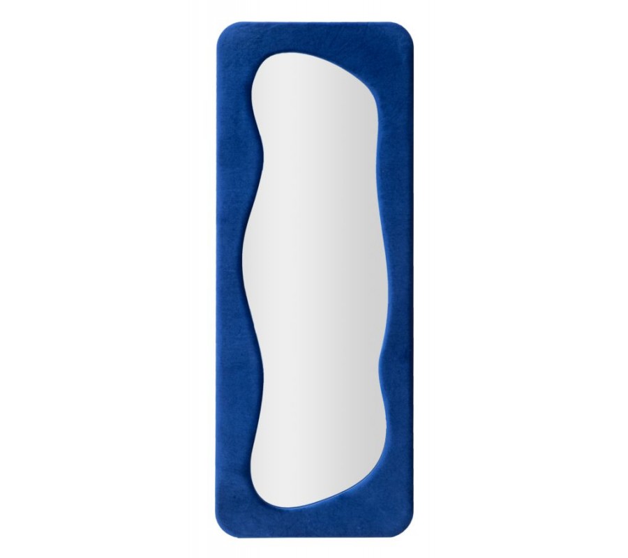 Zrkadlo Ripple zaujme svojím minimalistickým, no vizuálne nápaditým dizajnom. Obdĺžnikový formát so zaoblenými rohmi pôsobí uhladene a harmonicky, zatiaľ čo vlnité línie vnútornej zrkadlovej plochy vytvárajú dojem pohybu a dodávajú celku jemne umelecký charakter. Rám je potiahnutý zamatovým poťahom v sýtomodrej farbe, ktorá zvýrazňuje tvar aj odtieň a pôsobí elegantne.