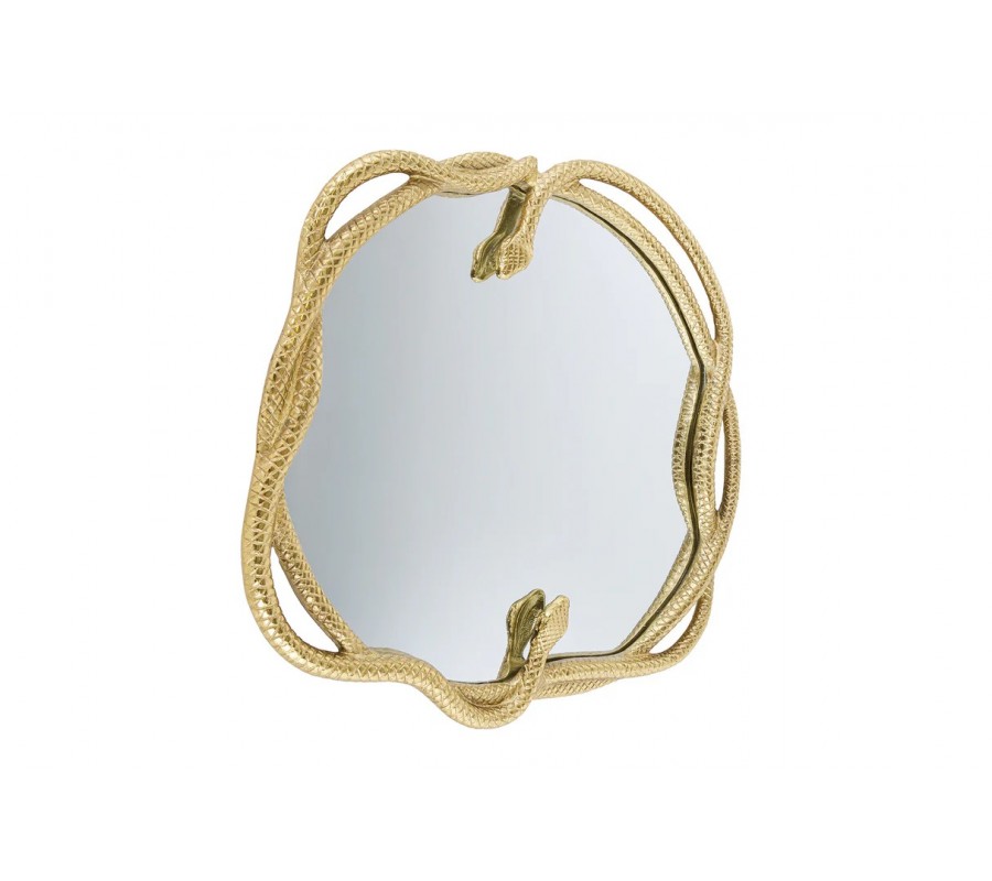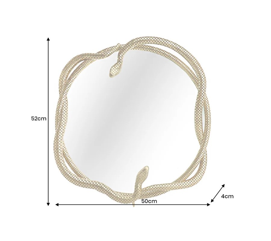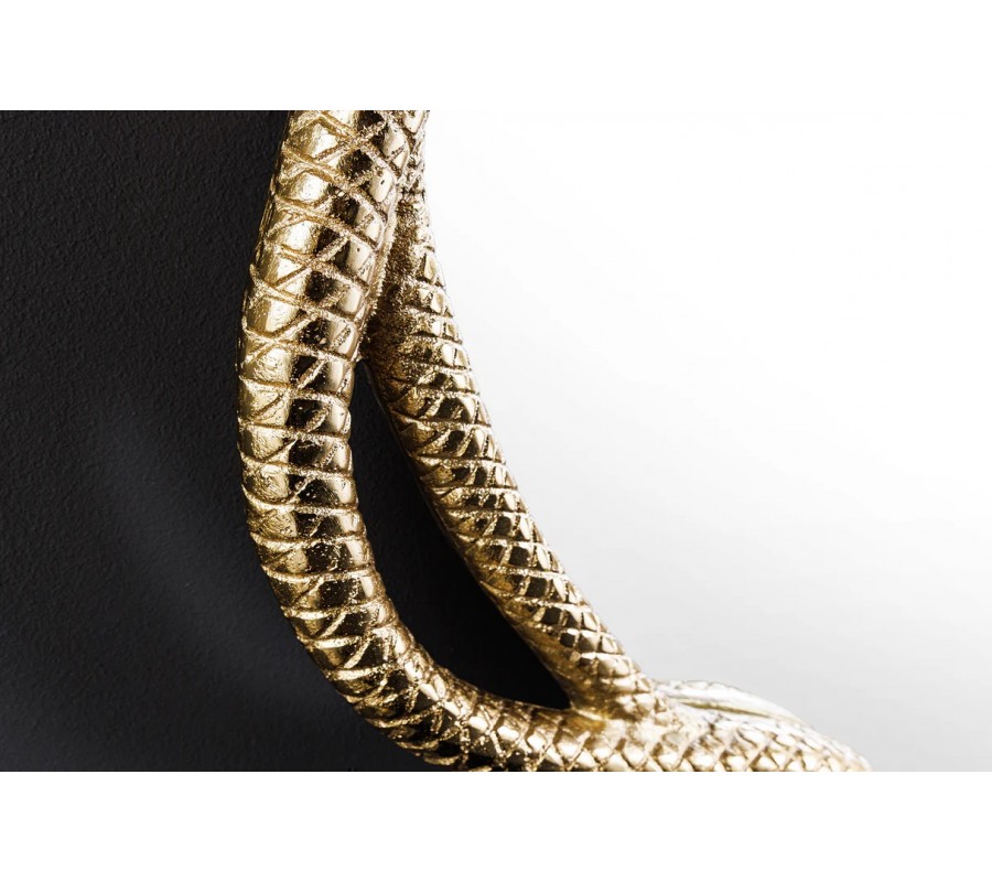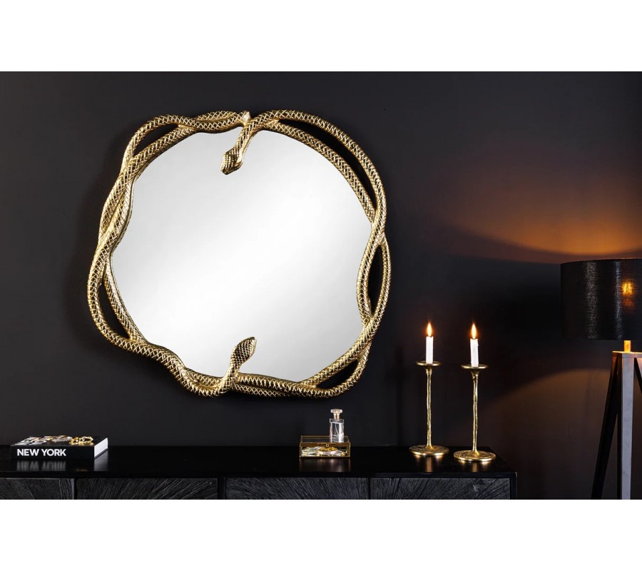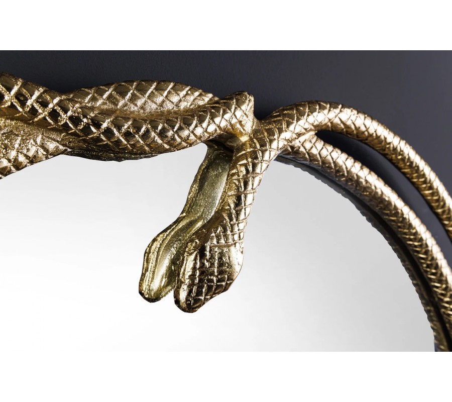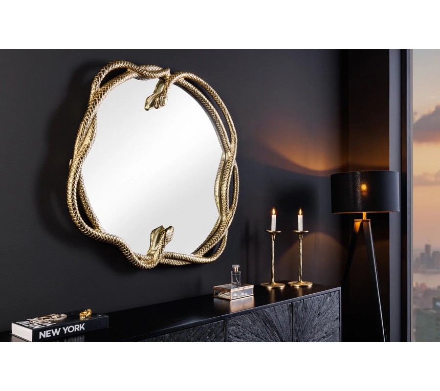 Zrkadlo Serpente je výnimočný interiérový prvok v art deco štýle, ktorý okamžite upúta svojou výraznou symbolikou a zmyslom pre detail. Rám v tvare spletitých hadov, ktoré akoby obopínali zrkadlo svojimi telami, je vyhotovený z kovu so zlatým povrchom, čím vnáša do priestoru drámy, elegancie a mystiky.