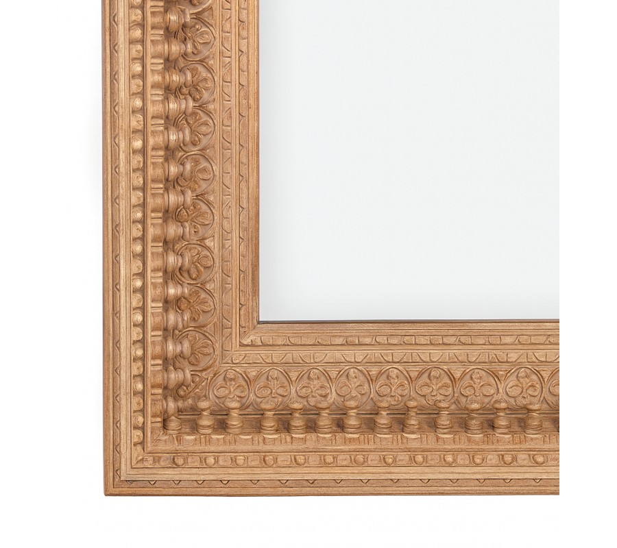 Obvod rámu zdobí pravidelné bohaté zdobenie, ktoré kombinuje geometrické prvky typické pre orientálny štýl s jemnými florálnymi motívmi, obľúbenými vo vidieckom dizajne. Rám je rozdelený na viacero sústredných obdĺžnikových plôch v rôznych výškach, čo vytvára dynamický vizuál a priestorovú hĺbku. Vyrezávané ornamenty tak pôsobia mimoriadne plasticky a živo. Rám je ručne opracovaný, čo zaručuje precíznosť a kvalitu prevedenia. Veľké množstvo drobných detailov a ich symetria tak pôsobia honosným a luxusným dojmom.