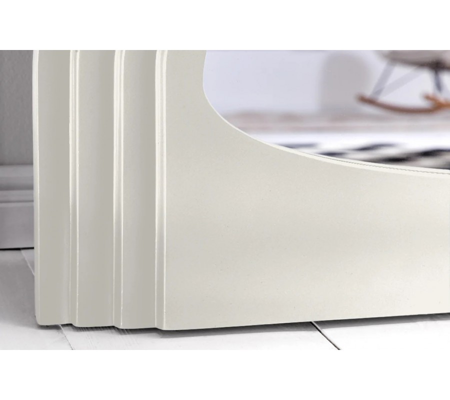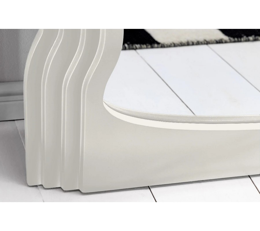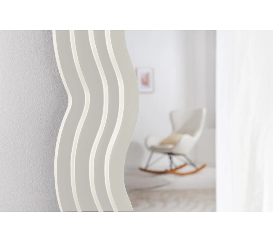 Zrkadlo má obdĺžnikový tvar s klenutou zaoblenou vrchnou časťou. Zrkadlovú plochu ohraničuje rám s hrúbkou 4 - 8 cm v bielej farbe. Bočné strany rámu sú ohýbané do pravidelných vlnoviek a plynule prechádzajú do vrchného oblúka. Povrch zdobí vrstvený reliéf pripomínajúci schodíky, klesajúce od zrkadlovej plochy k okraju rámu. Táto plastická štruktúra zdôrazňuje elegantné krivky a vytvára dynamický vizuál. Spodná časť rámu je hladká, s mierne prehnutou vrchnou líniou, ktorá výborne korešponduje s celkovým tvarom zrkadla.
