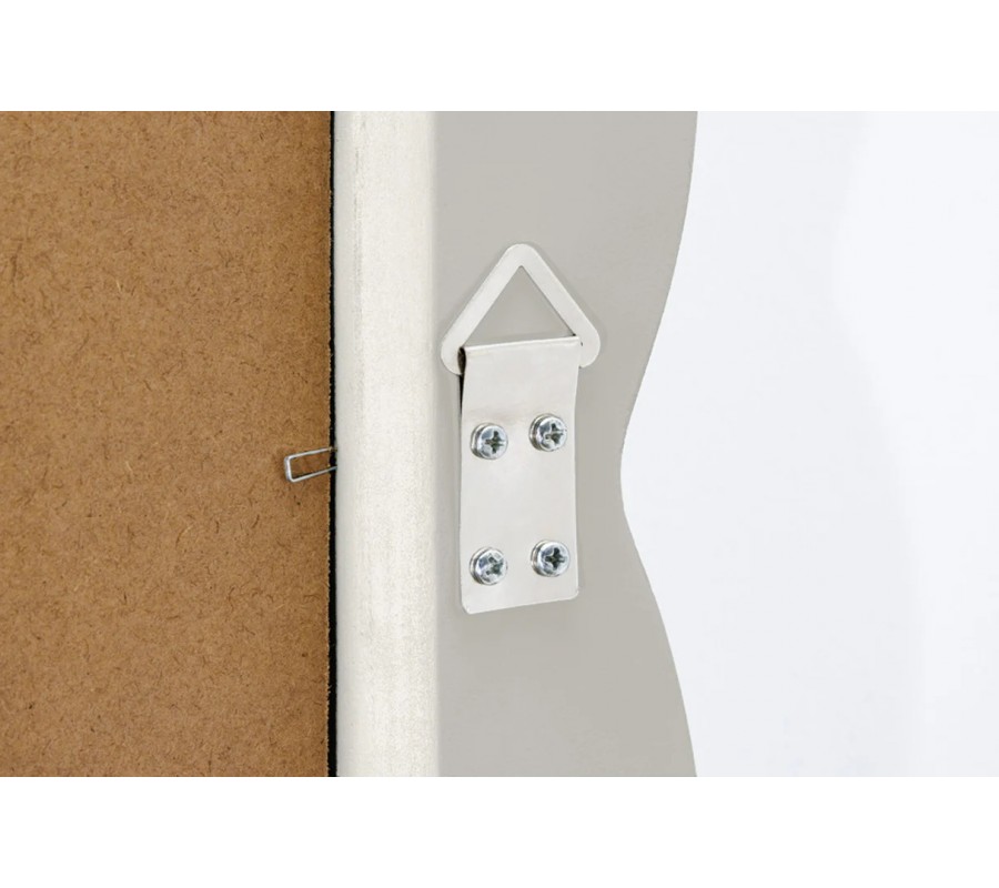 Zadná časť je podložená hnedou dyhou, ktorá spevňuje sklo. Na bočných stranách rámu sa tiež nachádzajú kovové ušká a zrkadlo tak môžete zavesiť na stenu, alebo položiť na podlahu.