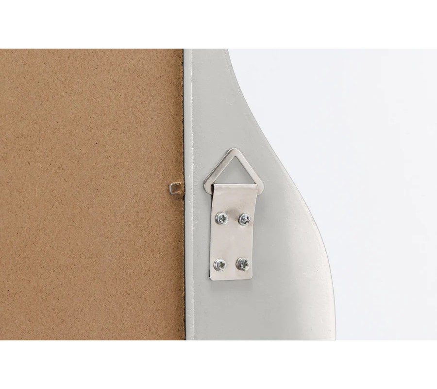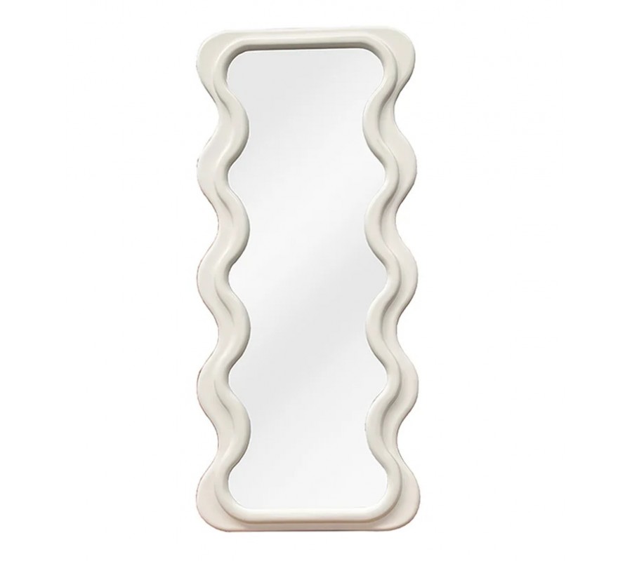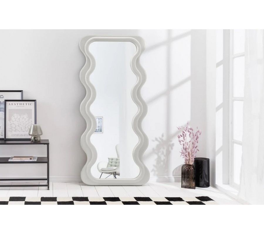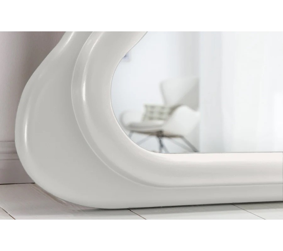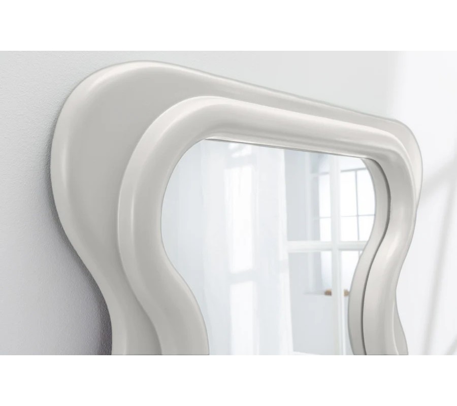 Zrkadlo má obdĺžnikový tvar s pravidelne zvlnenými bočnými stranami. Vrchná a spodná strana sú rovné, zatiaľ čo výrazne zaoblené rohy podporujú plynulý vizuál. Rám má bielu farbu a dvojúrovňový dizajn, s užšou vyššou vrstvou pri zrkadlovej ploche a nižšou širšiu vrstvou na okraji. Toto plastické reliéfne tvarovanie zdôrazňuje originálny tvar a zároveň vytvára dynamický vizuál v rámci elegantného bieleho prevedenia.
