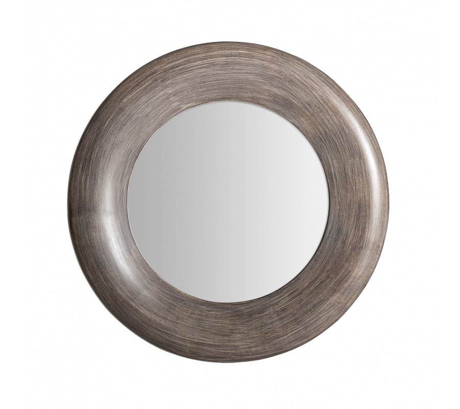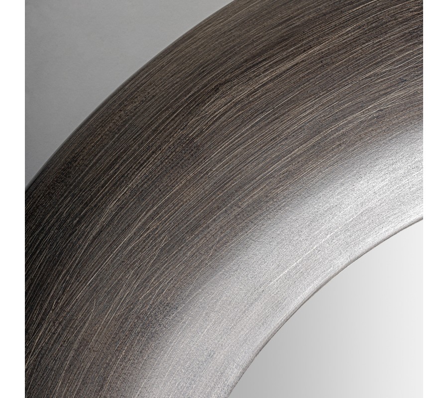 Rám má zaujímavý profil s vyvýšeným, jemne zaobleným vonkajším okrajom, ktorý postupne prechádza dovnútra k zrkadlovej ploche. Tá je mierne zapustená, čo vytvára plastičnosť a príjemnú hĺbku. Povrchová úprava rámu je zdobená jemnou patinou, ktorá pripomína prírodné drevo so zreteľnou štruktúrou – s optickými náznakmi letokruhov, odrenín a stôp času, čím zrkadlo získava autentický rustikálny výraz.