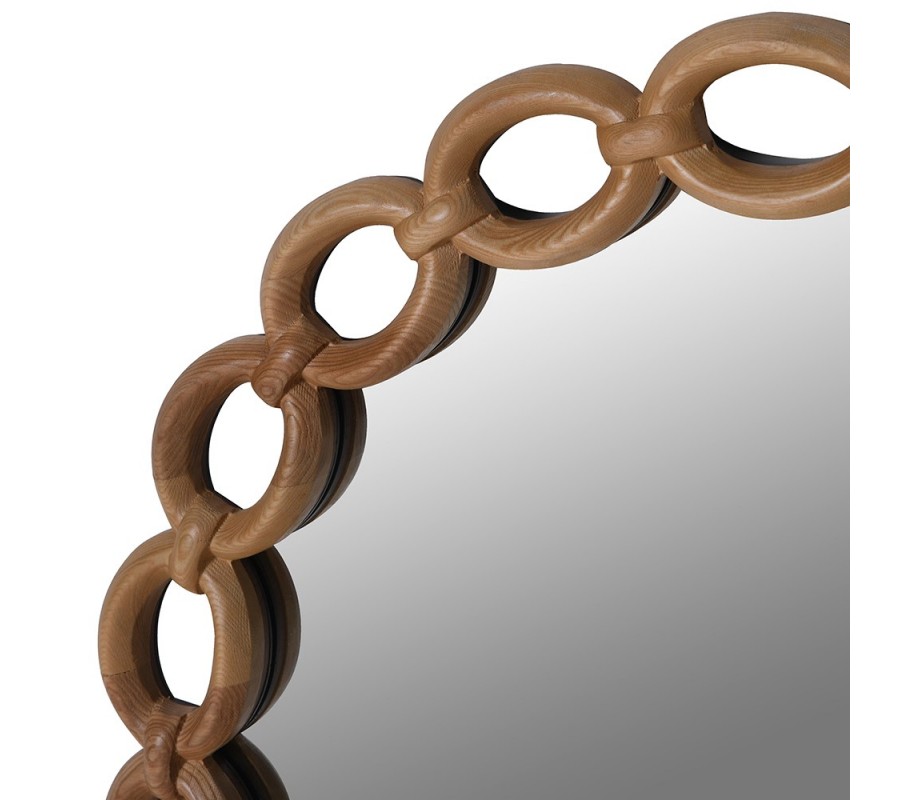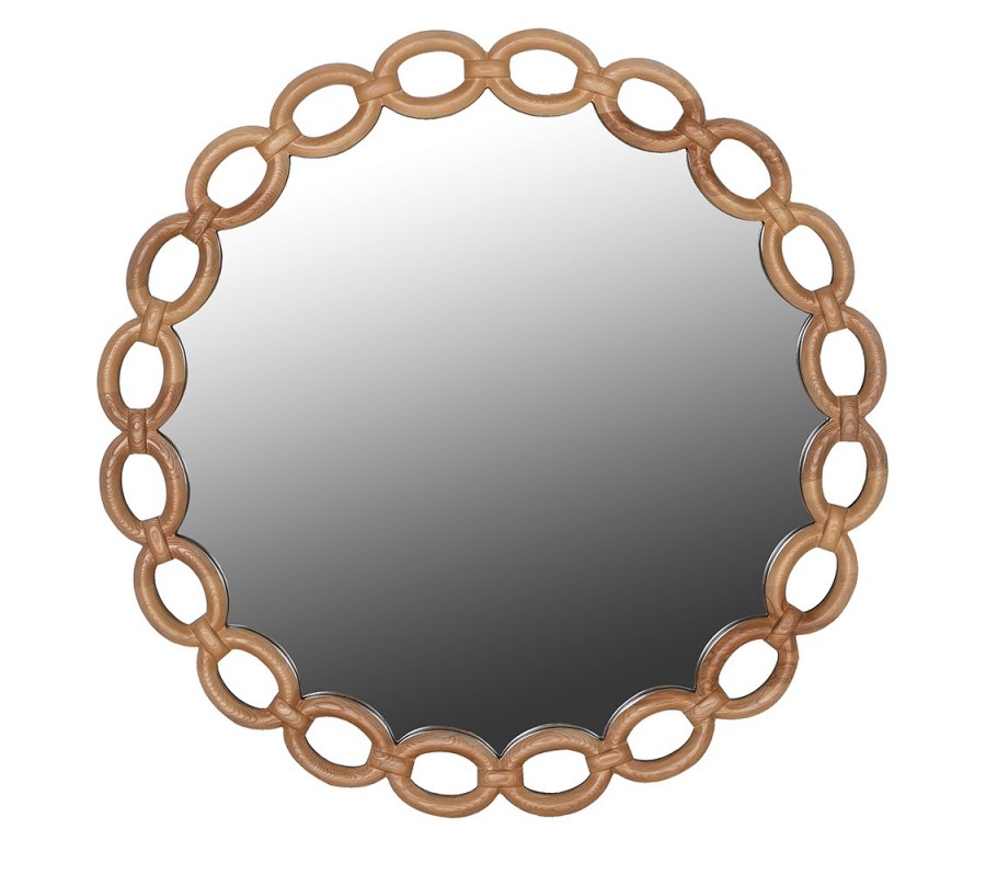 Retro okrúhle nástenné zrkadlo Chain je výrazný dizajnový prvok, ktorý zaujme už na prvý pohľad. Jeho rám je vyrobený z prírodného dreva v hnedom odtieni a tvorený prepojenými oválnymi článkami, ktoré pripomínajú reťazový vzor. Povrch rámu je zdobený výraznou štruktúrou dreva, ktorá dodáva zrkadlu autentický a prirodzený charakter.