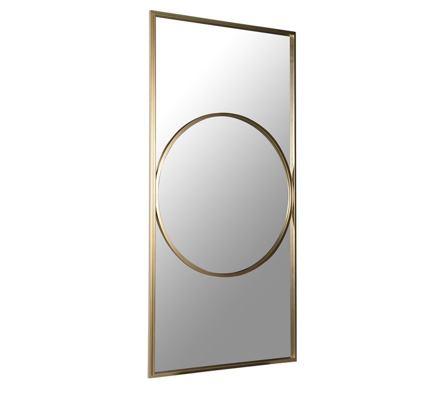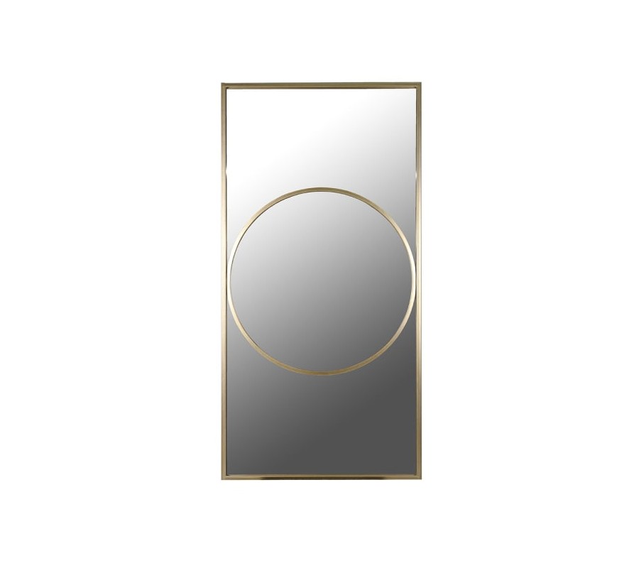 Zrkadlo má obdĺžnikový tvar, pričom uprostred sa nachádza výrazný orámovaný kruh. Ten tvorí pôsobivý vizuálny kontrast a originálny umelecký charakter. Kovové rámovanie v lesklej zlatej farbe mu dodáva sofistikovaný luxusný vzhľad a podčiarkuje jeho glamour štýl. Rám je mierne vyvýšený od zrkadlovej plochy, čo vytvára jemnú vizuálnu hĺbku. Zo zadnej strany je zrkadlo spevnené MFD dyhou pre maximálnu pevnosť a stabilitu.