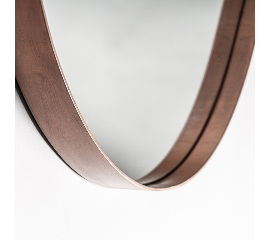 Luxusné nástenné zrkadlo Ferah v sebe spája nadčasovú eleganciu s jemne umeleckým výrazom a vyniká svojím asymetrickým oblým tvarom, ktorý pôsobí moderne a zároveň organicky plynulo. Úzky kovový rám má výrazne plochý a mierne vystúpený profil, ktorý pri pohľade zblízka vytvára rafinovaný trojrozmerný efekt. Je vyhotovený v teplom medenom odtieni a precízne spracovaný do hladkej línie, ktorá celému zrkadlu dodáva luxusný charakter a hrejivý vizuálny akcent.