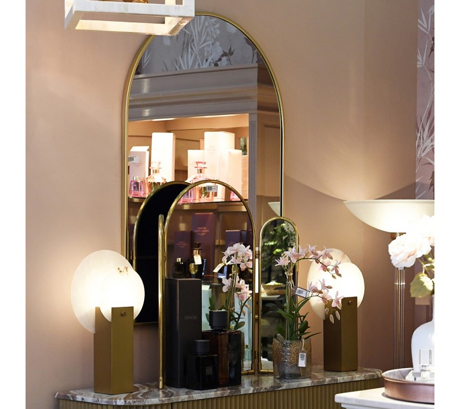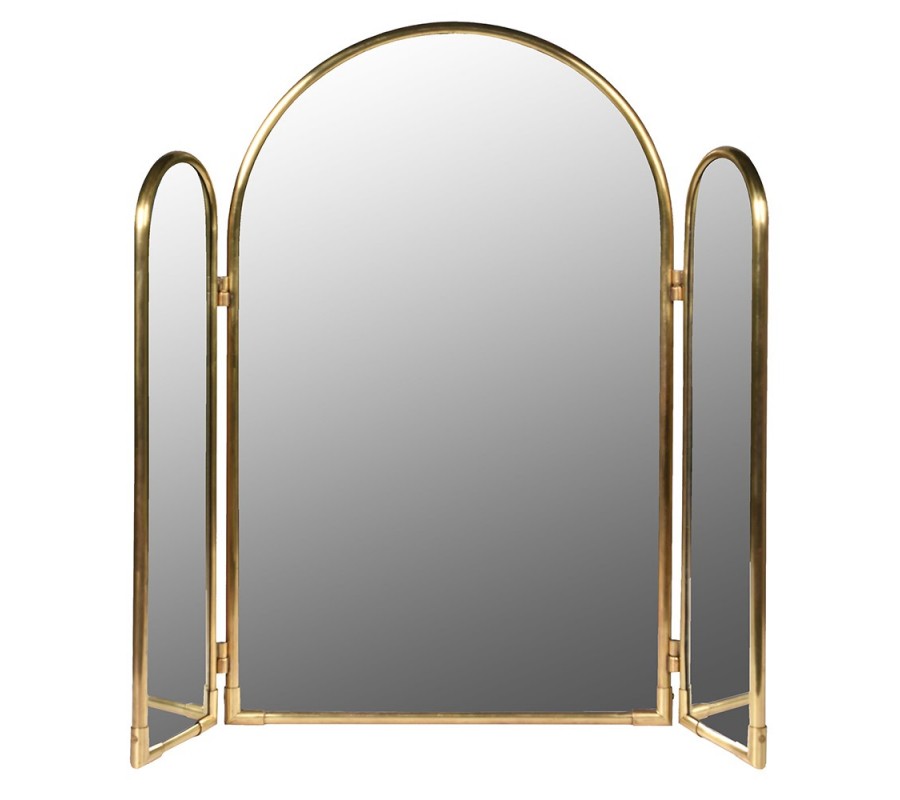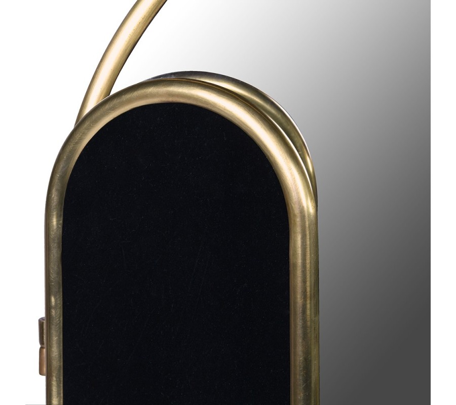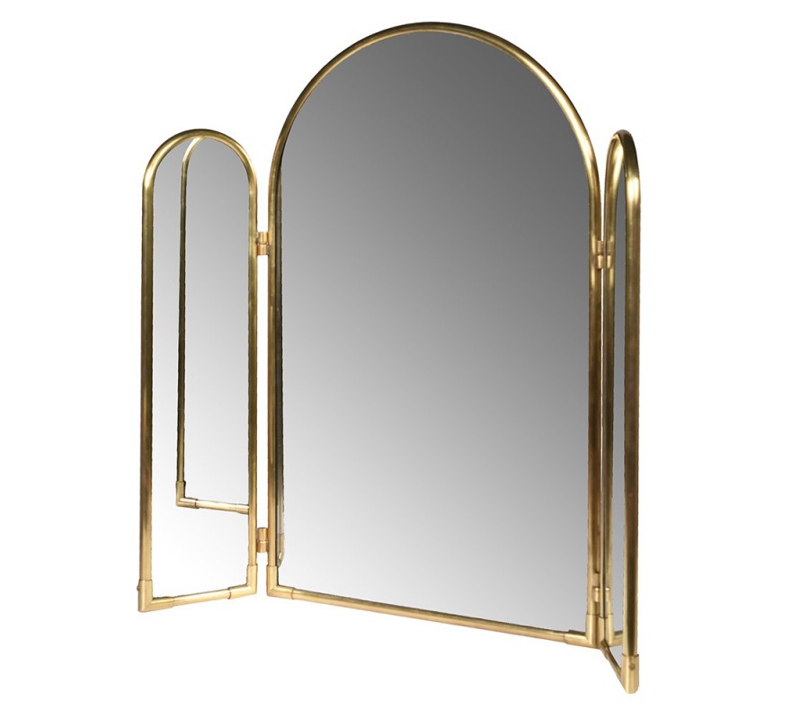 Zrkadlo je zložené z troch panelov. Každý je ohraničený rámom z kovu v zlatej farbe s valcovitým tvarovaním, ktoré podčiarkne elegantné zaoblenia. Vyšší stredný panel má šírku 46 cm a spodný obdĺžnikový rám dopĺňa oblúk vo vrchnej časti.