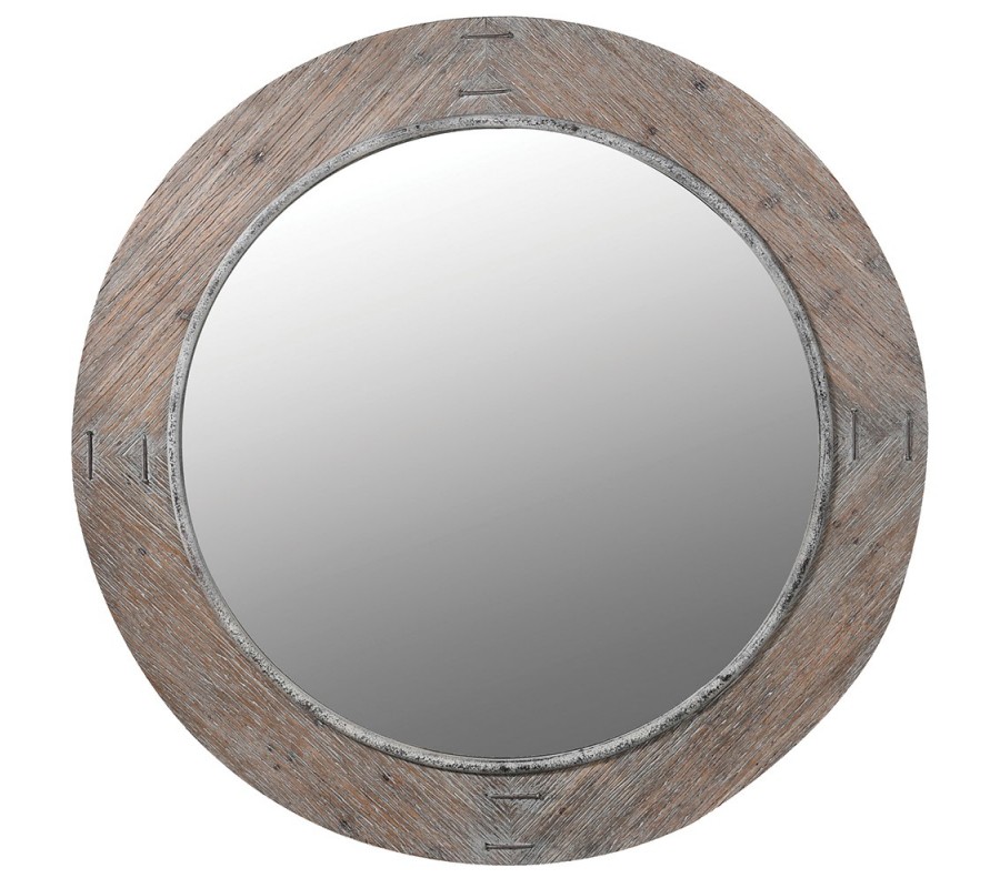 Zrkadlová plocha má okrúhly tvar a ohraničuje ju široký rám z dyhovaného dreva. Jeho naturálnu hnedú farbu dopĺňa výrazná hlboká štruktúra. Je v dizajne organizovaná diagonálne a vytvára tak zaujímavý geometrický obrazec, v ktorom kontrastujú rovné línie letokruhov s celkovou oblou siluetou. Kresbu dreva podčiarkuje aj starožitný efekt vymytého náteru, usadeného v hlbších ryhách.