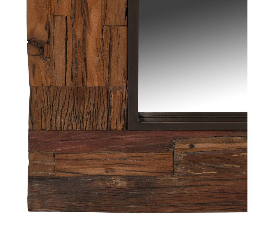 Rám je tvorený masívnymi drevenými segmentmi, ktoré sa líšia tónom, kresbou aj mierou opotrebovania, čo vytvára bohatý, vrstvený vizuálny efekt. Farebnosť sa pohybuje v hnedých a zemitých odtieňoch, od svetlejších až po tmavšie, patinované plochy, ktoré dodávajú zrkadlu hĺbku, teplo a autentický prírodný vzhľad.