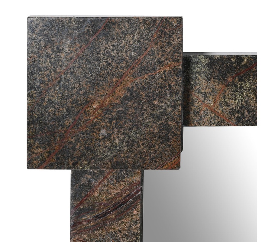 Štvorcovú zrkadlovú plochu ohraničuje rovný rám z mramoru, ktorý na rohoch dopĺňajú štyri štvorcové prvky, mierne presahujúce jeho šírku. Dizajn je moderný, geometrický a minimalistický. Konštrukcia je spevnená kovom.