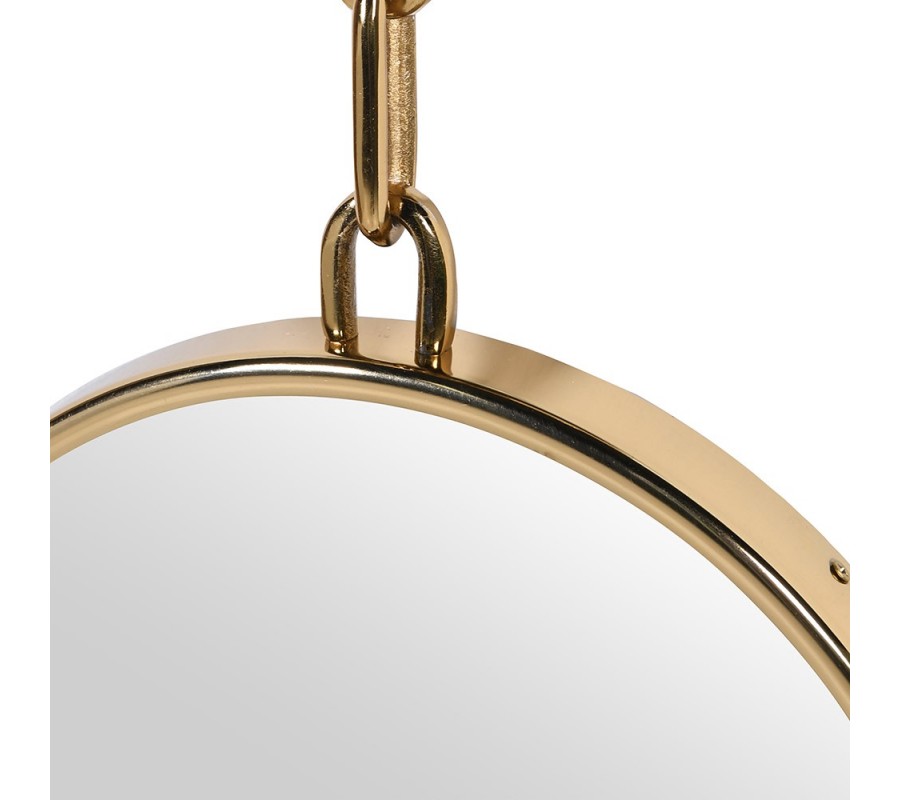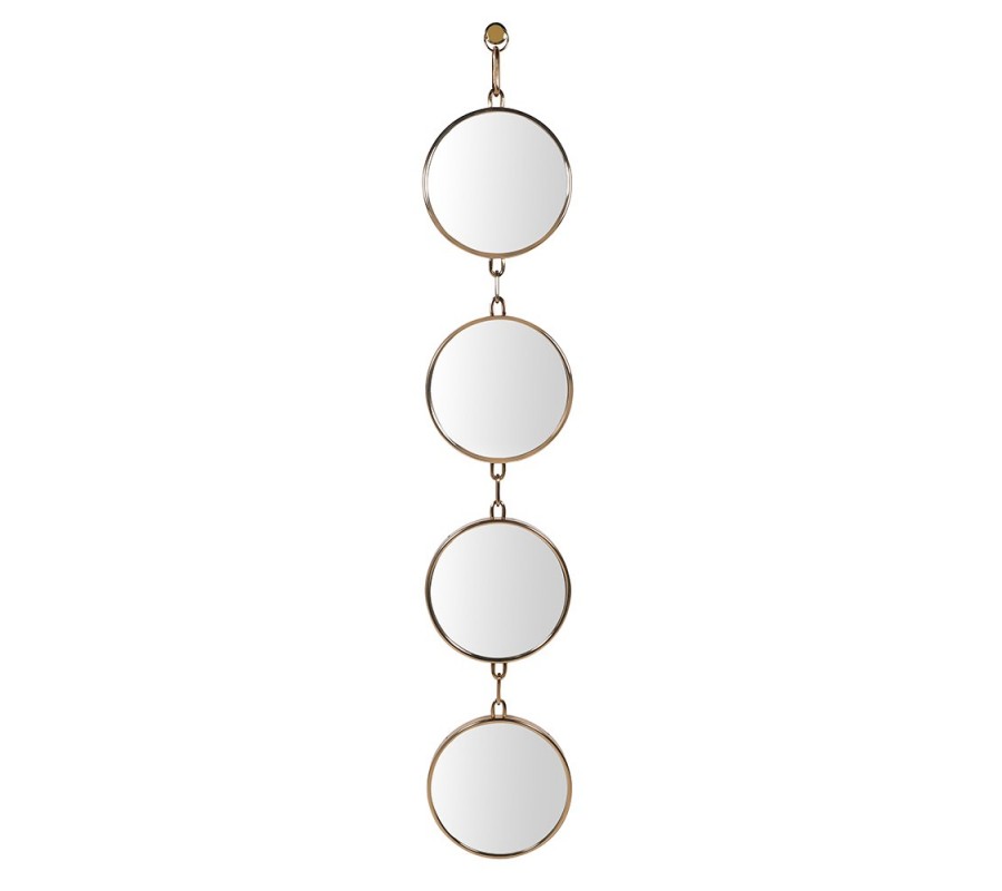 Zrkadlo je tvorené štyrmi okrúhlymi zrkadlami, ktoré sú vertikálne prepojené kovovými reťazami v zlatej farbe. Každé zrkadlo má tenký zlatý kovový rám, ktorý pôsobí jemne a elegantne a zároveň zvýrazňuje čistý tvar zrkadlovej plochy. Zo zadnej strany sú zrkadlá spevnené stabilnou nosnou vrstvou, ktorá zabezpečuje pevnosť, odolnosť a kvalitné spracovanie.