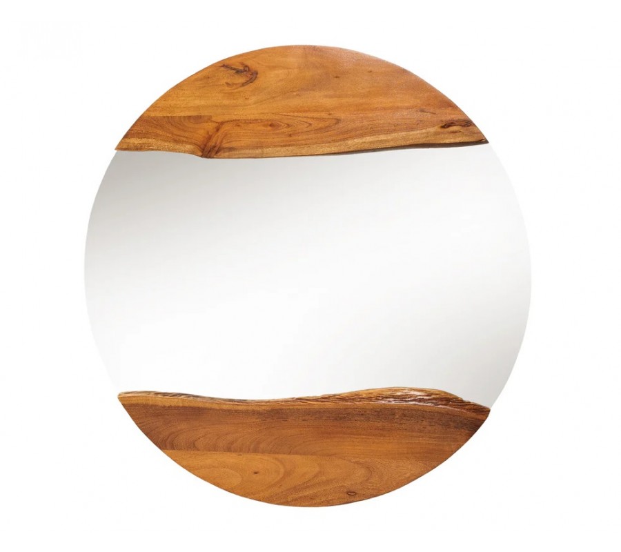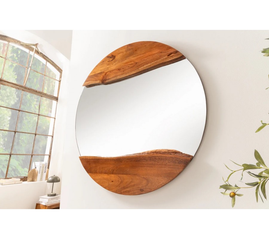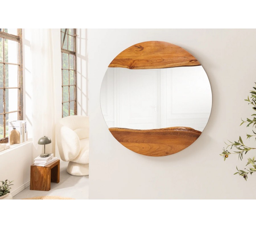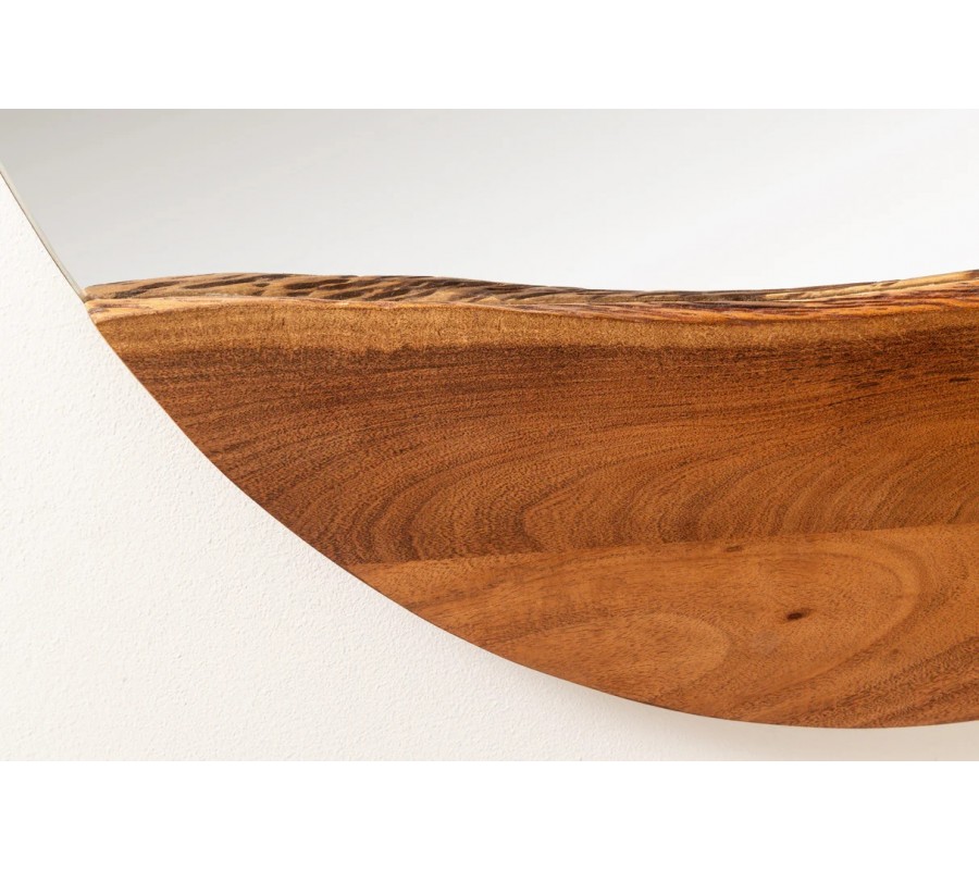 Zrkadlová plocha má okrúhly geometrický tvar a vo vrchnej a spodnej časti ju dopĺňa drevený rám, zatiaľ čo bočné strany majú odhalené okraje skla. Masívne akáciové drevo v medovej hnedej farbe dopĺňa výrazná kresba letokruhov, ktorá podčiarkuje prírodný vizuál. Vonkajšia hrana dreva je tvarovaná podľa kružnice a presne dopĺňa siluetu zrkadla. Vnútorná hrana je zvlnená a sleduje prirodzenú štruktúru dreva v tzv. live edge dizajne. Zadná strana zrkadla je spevnená dyhou a obsahuje úchytky na zavesenie na stenu.