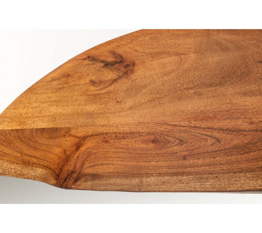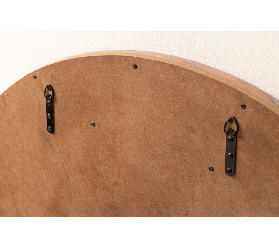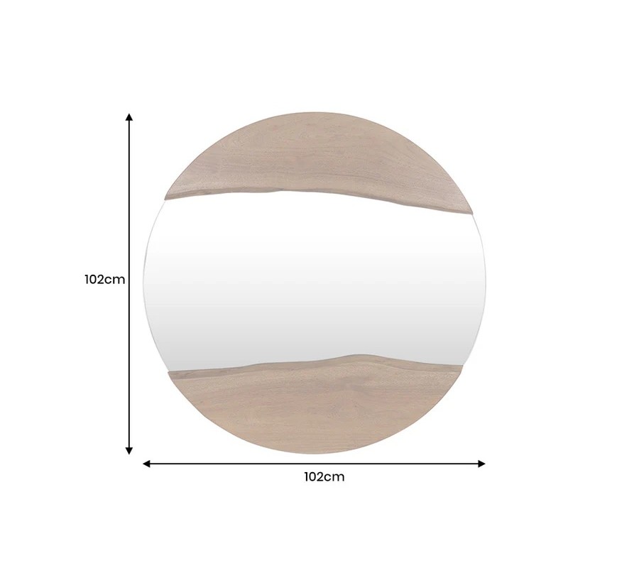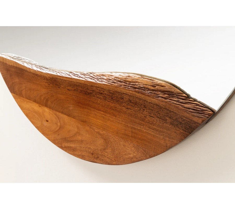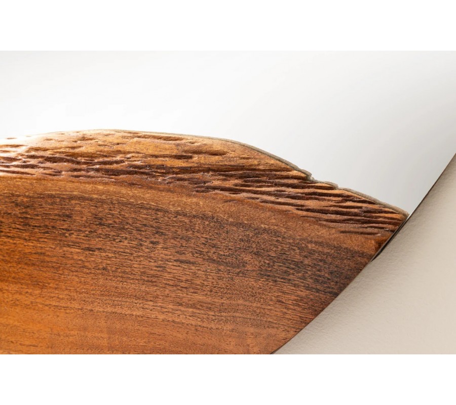 Zrkadlová plocha má okrúhly geometrický tvar a vo vrchnej a spodnej časti ju dopĺňa drevený rám, zatiaľ čo bočné strany majú odhalené okraje skla. Masívne akáciové drevo v medovej hnedej farbe dopĺňa výrazná kresba letokruhov, ktorá podčiarkuje prírodný vizuál. Vonkajšia hrana dreva je tvarovaná podľa kružnice a presne dopĺňa siluetu zrkadla. Vnútorná hrana je zvlnená a sleduje prirodzenú štruktúru dreva v tzv. live edge dizajne. Zadná strana zrkadla je spevnená dyhou a obsahuje úchytky na zavesenie na stenu.