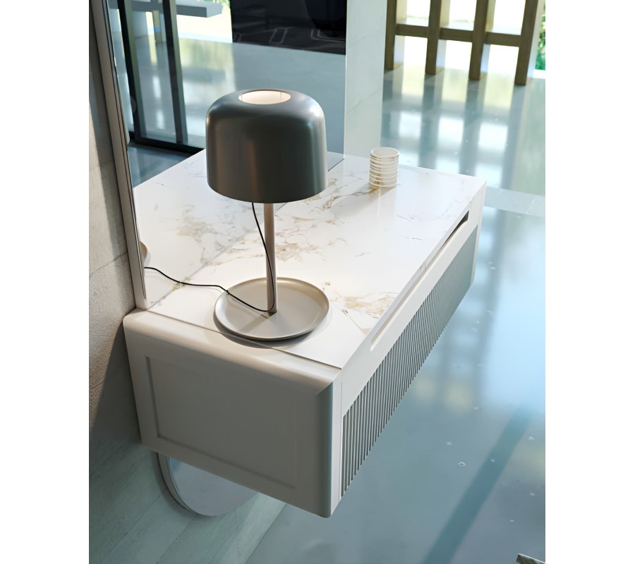 Vrchná doska zásuvky je riešená v mramorovom dizajne, ktorý dodáva celku luxusný charakter a vytvára elegantný kontrast k drevenému korpusu. Hladké, jemne zaoblené hrany zvyšujú estetickú hodnotu aj komfort pri používaní. K dispozícii je varianta s drevenou doskou vo farbe podľa zvoleného prevedenia.