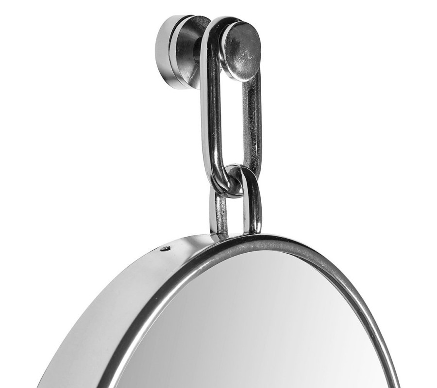 Glamour nástenné zrkadlo Sonia je elegantný a dekoratívny doplnok, ktorý vyniká svojím jemným, no výrazným dizajnom. Tvorí ho dvojica okrúhlych zrkadlových plôch v tenkom striebornom kovovom ráme, pričom spodné zrkadlo je väčšie ako horné. Obe časti sú prepojené jemnou kovovou reťazou, ktorá dodáva zrkadlu ľahký šperkovo-dekoratívny charakter. Horná časť je zakončená praktickým háčikom na zavesenie.