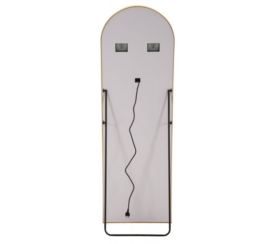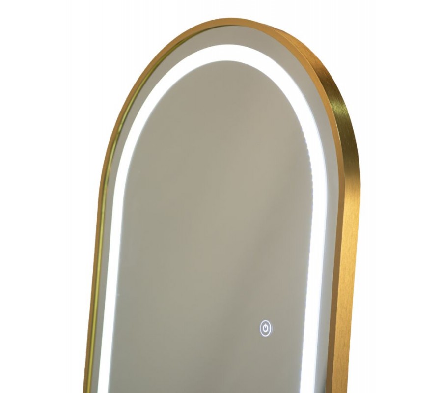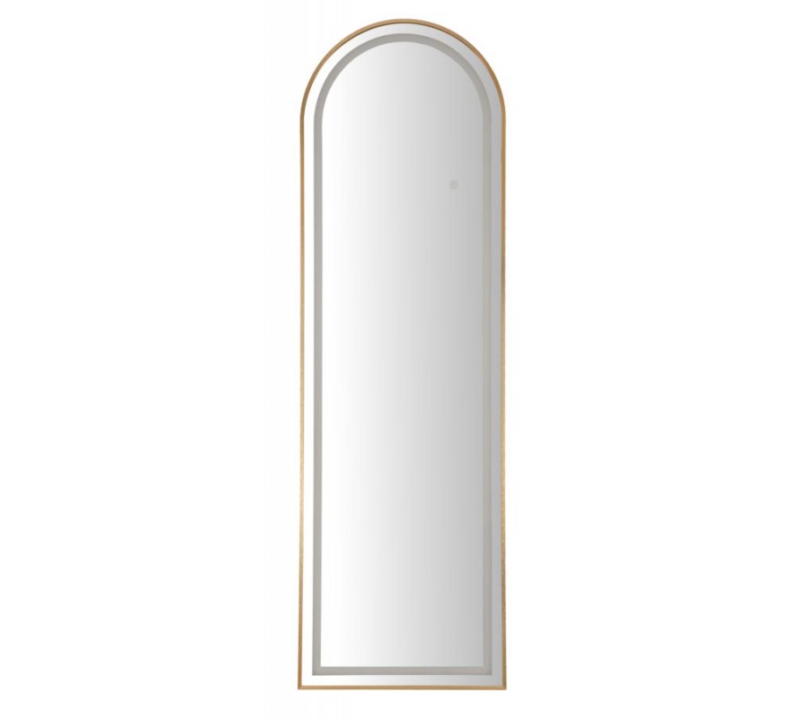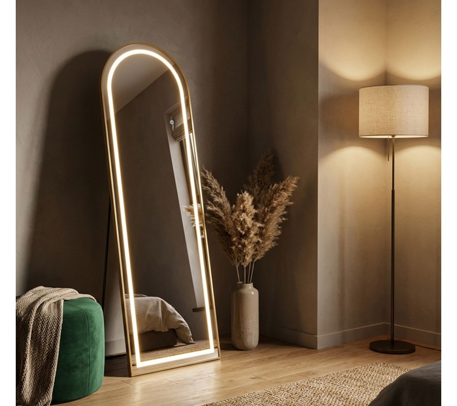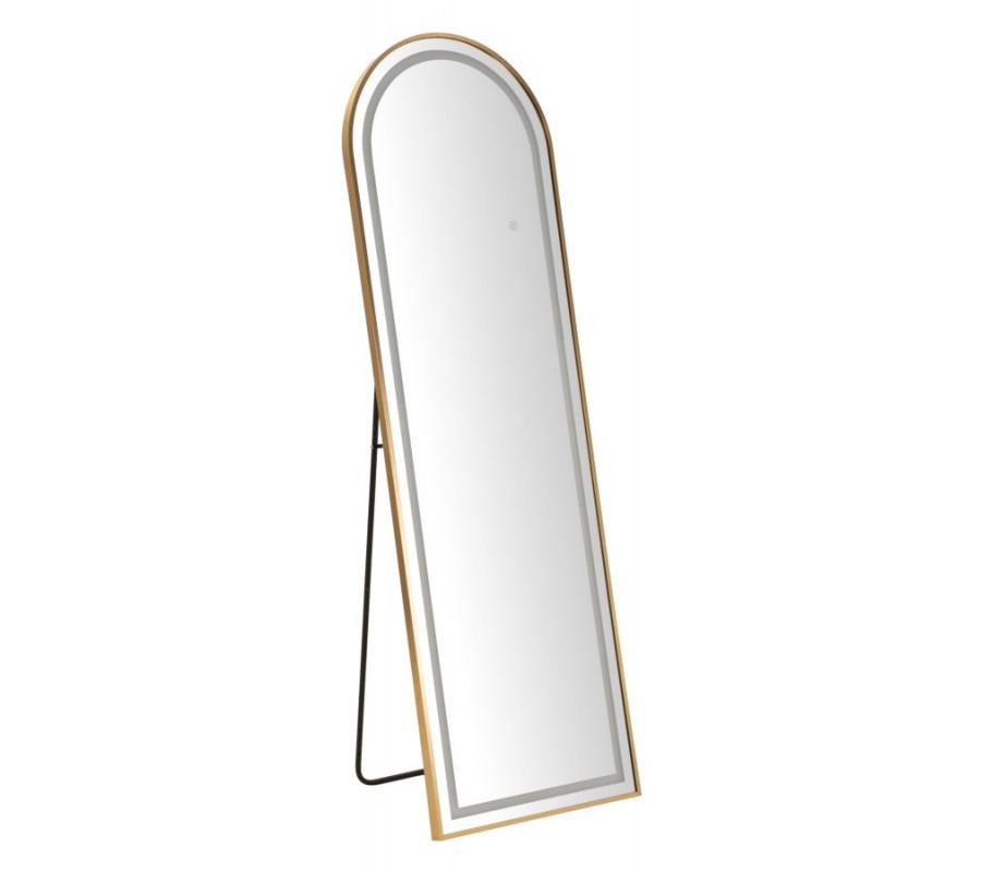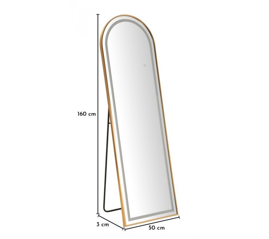 Dizajnové glamour stojace zrkadlo Leanor so zlatým rámom s oblúkovou vrchnou časťou a LED osvetlením 160 cm