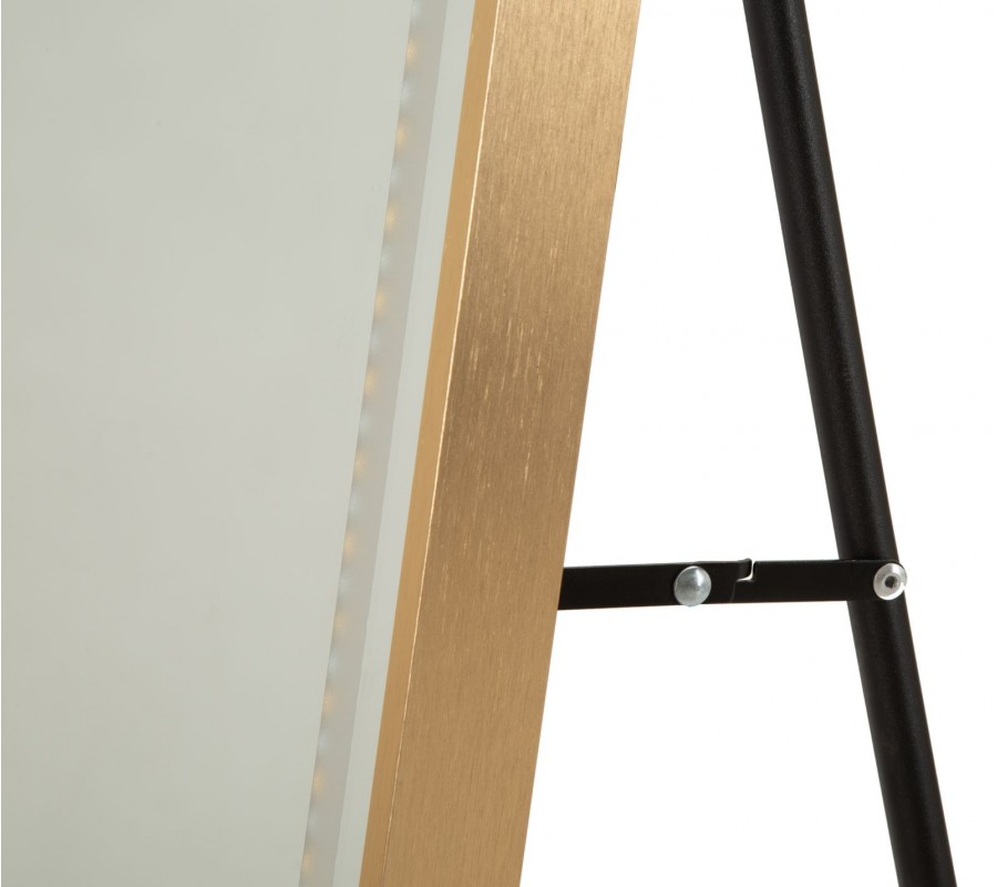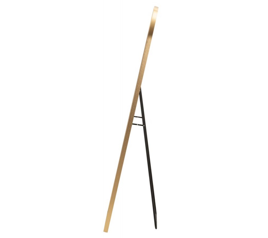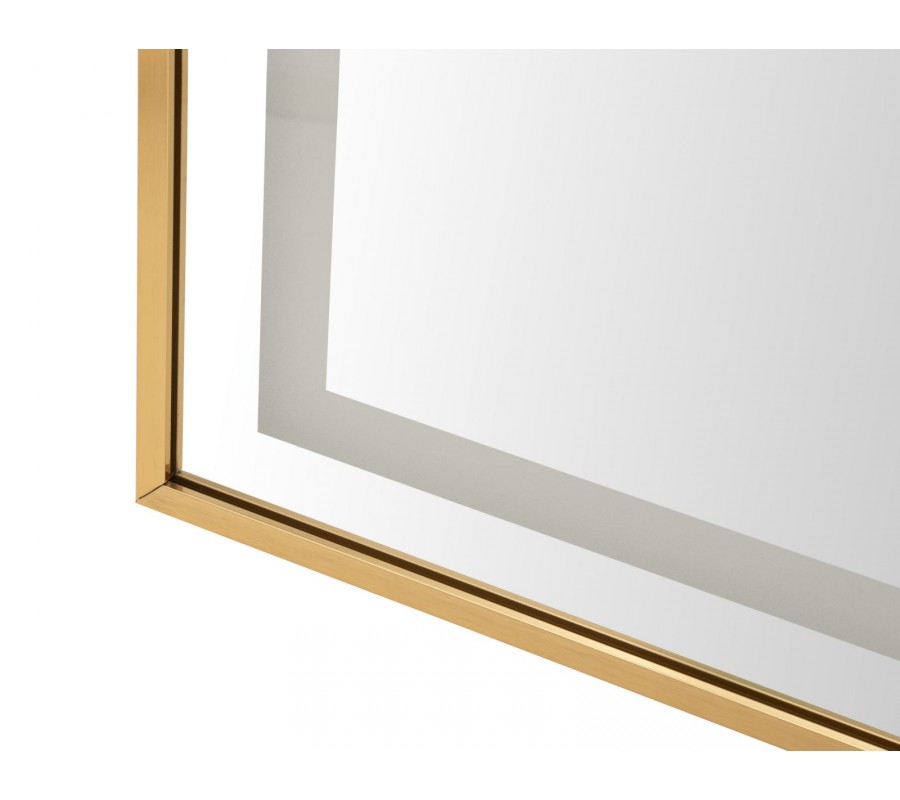Zrkadlová plocha má vyššiu štíhlu siluetu, so spodnou časťou v tvare obdĺžnika a vrchnou časťou zakrivenou do klenutého oblúka. Ohraničuje ju hladký kovový rám v lesklom zlatom prevedení, ktorý prináša do dizajnu dotyk luxusu.