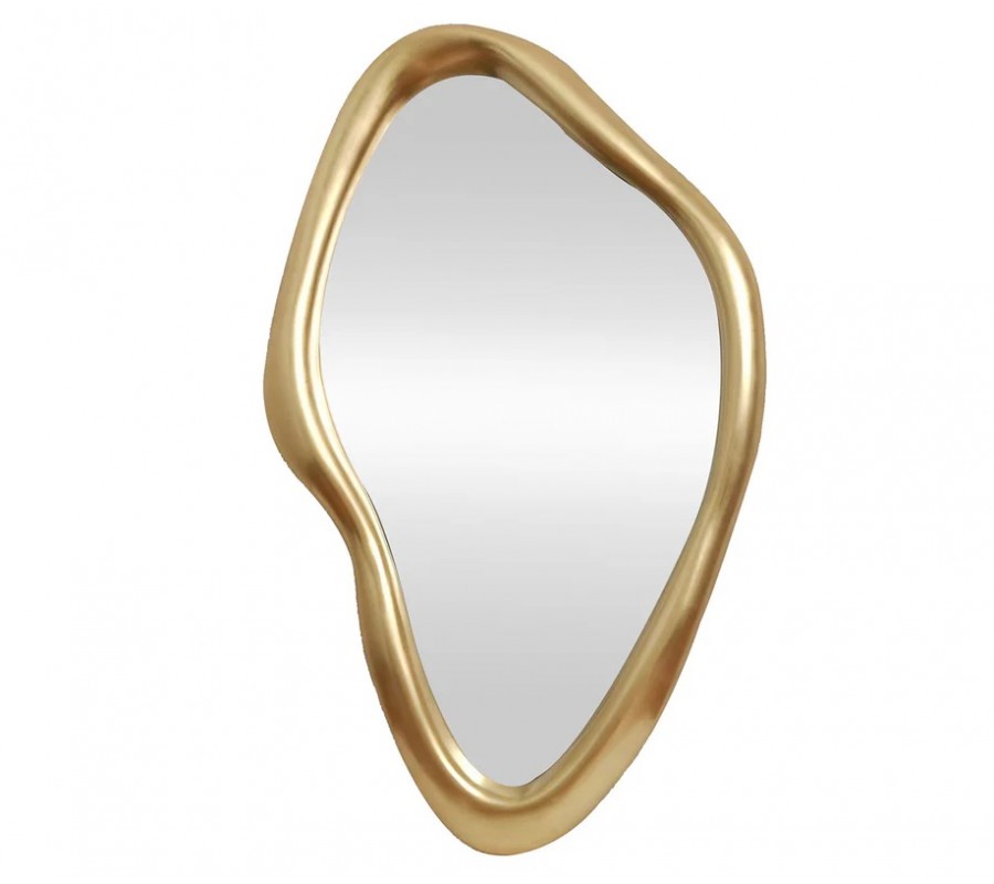 Glamour závesné zrkadlo Selene je elegantným dizajnovým doplnkom, ktorý zaujme nepravidelným organickým tvarom a luxusným zlatým rámom z umelej živice. Mäkké, plynulé línie pôsobia prirodzene a sofistikovane zároveň, vďaka čomu zrkadlo plní nielen praktickú funkciu, ale stáva sa aj výrazným dekoratívnym prvkom na stene. Živicový rám umožňuje precízne tvarovanie detailov a zároveň má nízku hmotnosť, čo výrazne uľahčuje manipuláciu a montáž. Hladký, jemne lesklý povrch rámu krásne odráža svetlo a dodáva priestoru noblesný glamour charakter.