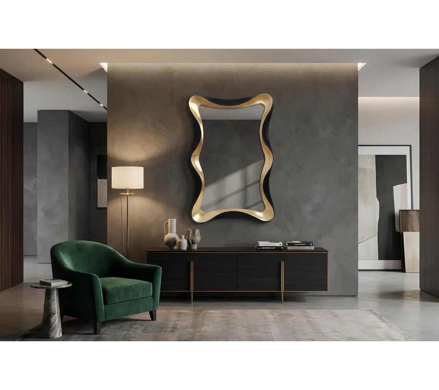 Glamour nástenné zrkadlo Yraj je výrazný dizajnový doplnok, ktorý v interiéri okamžite upúta pozornosť. Má obdĺžnikový tvar s originálnym vlnkovitým rámom, ktorého vnútorné hrany sú v luxusnom zlatom prevedení a vonkajšie hrany v elegantnej čiernej farbe. Táto kontrastná kombinácia dodáva zrkadlu sofistikovaný glamour charakter s jemným nádychom art deco.